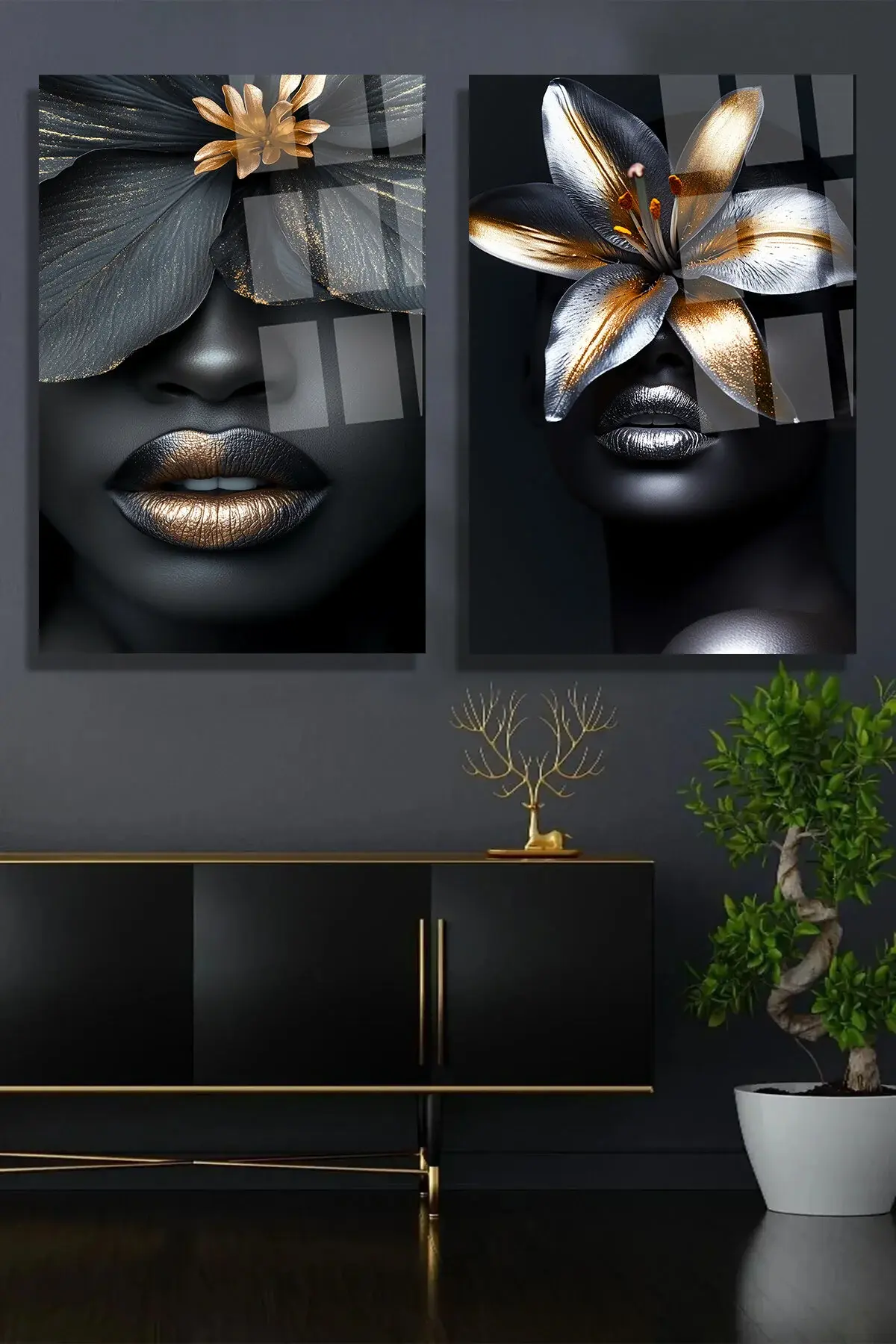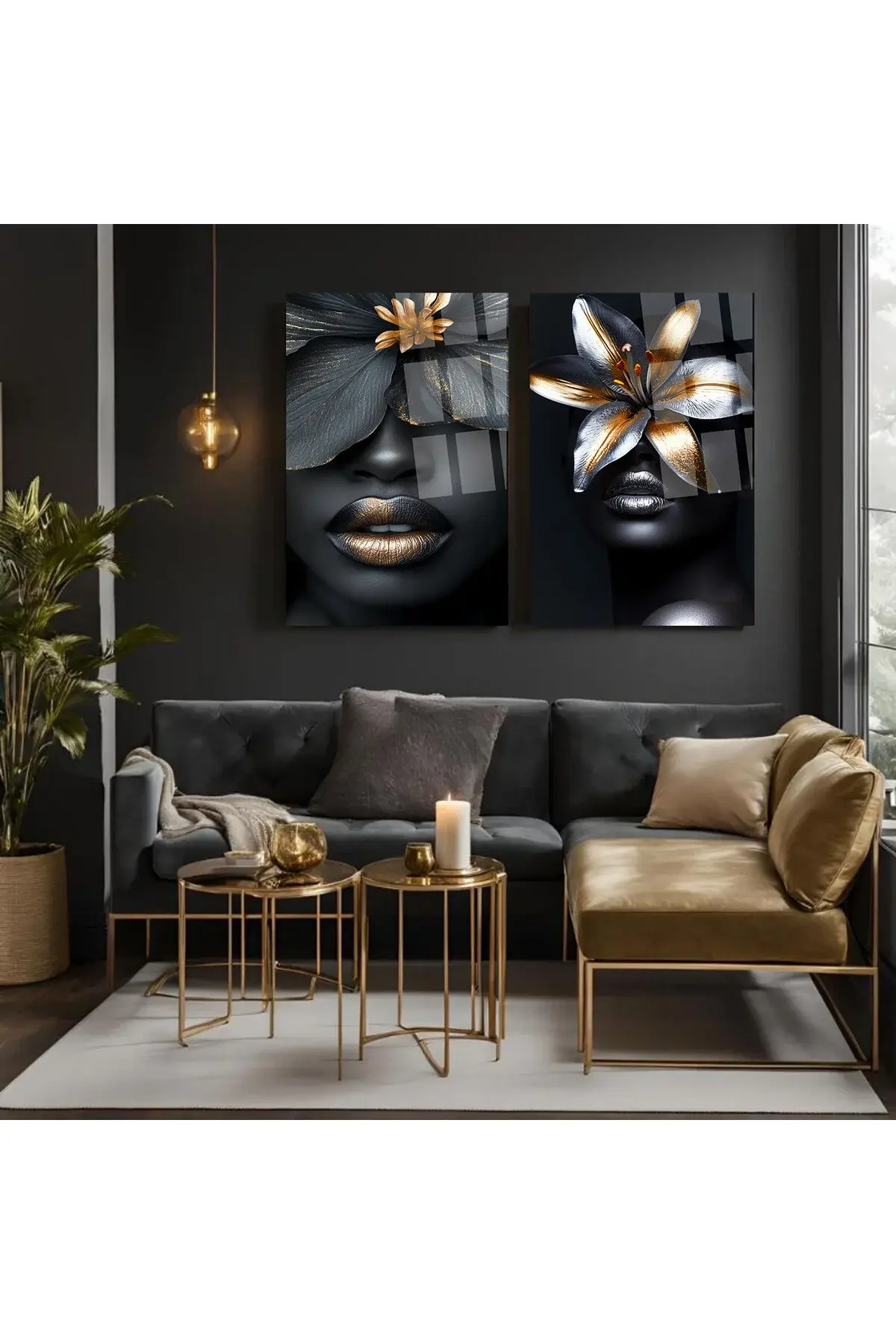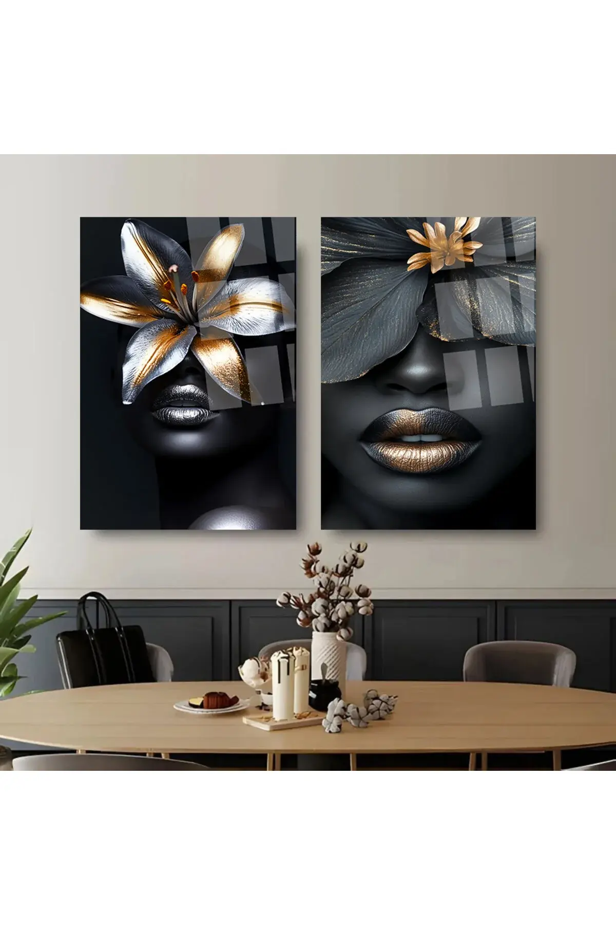 2 Lİ AFRİKALI KADIN GOLD, ELMAS DETAY CAM TABLO ULRTA CANLI RENK CAM TABLO EV HEDİYESİ KIRILMAZ CAM Siyah