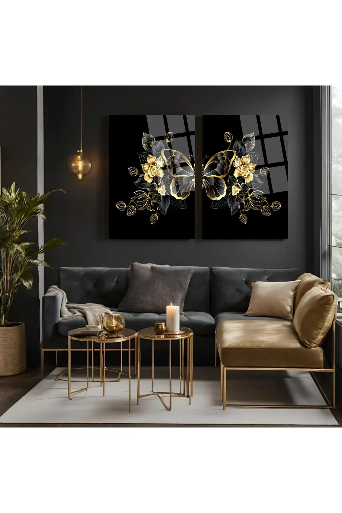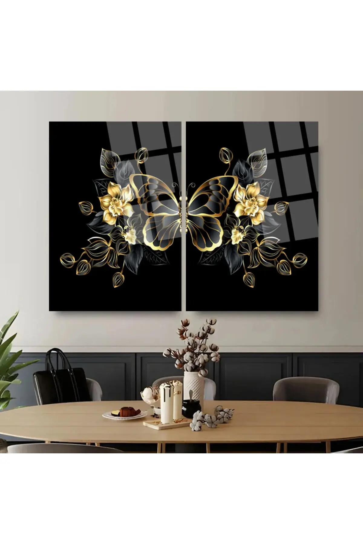 2 Lİ ALTIN KELEBEK SET CAM TABLO KIRILMAZ CAM TABLO ULTRA CANLI RENKLER Siyah