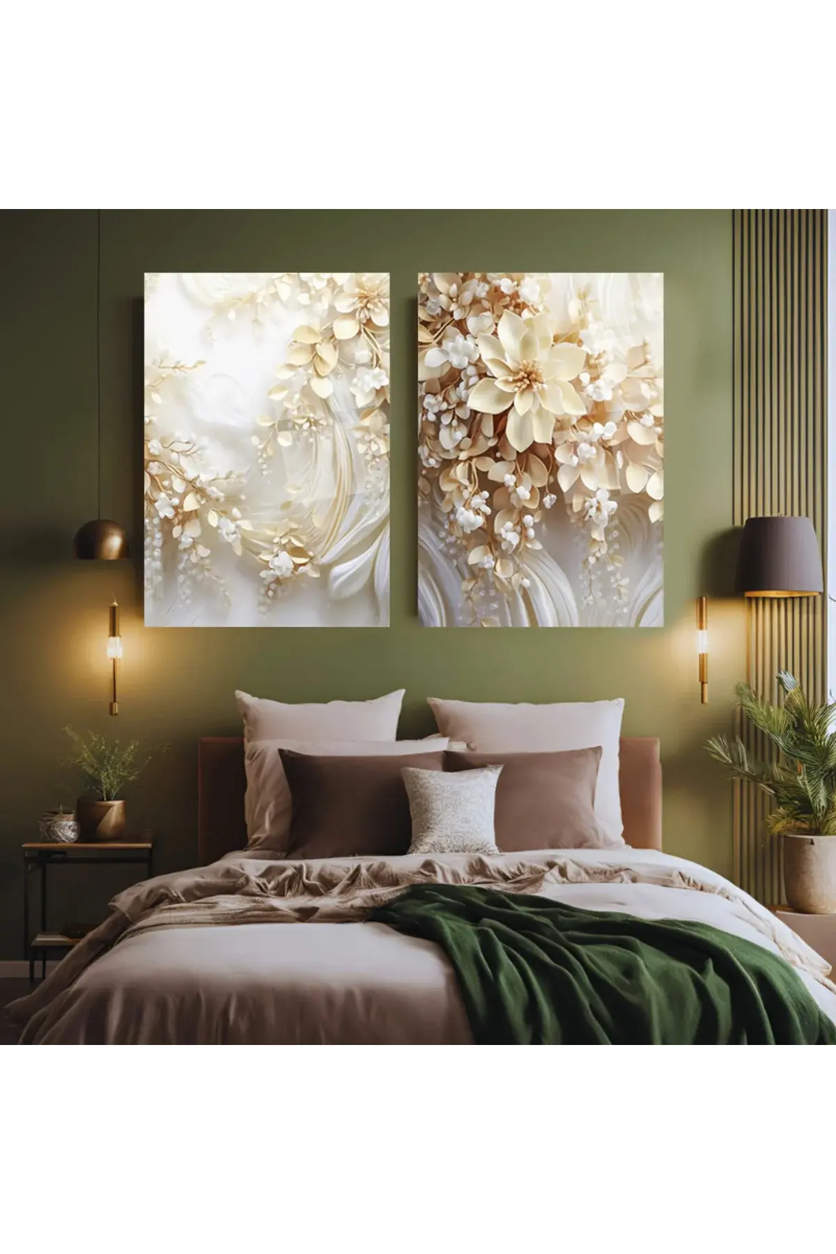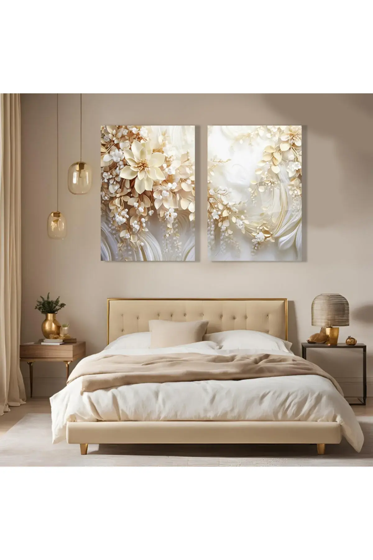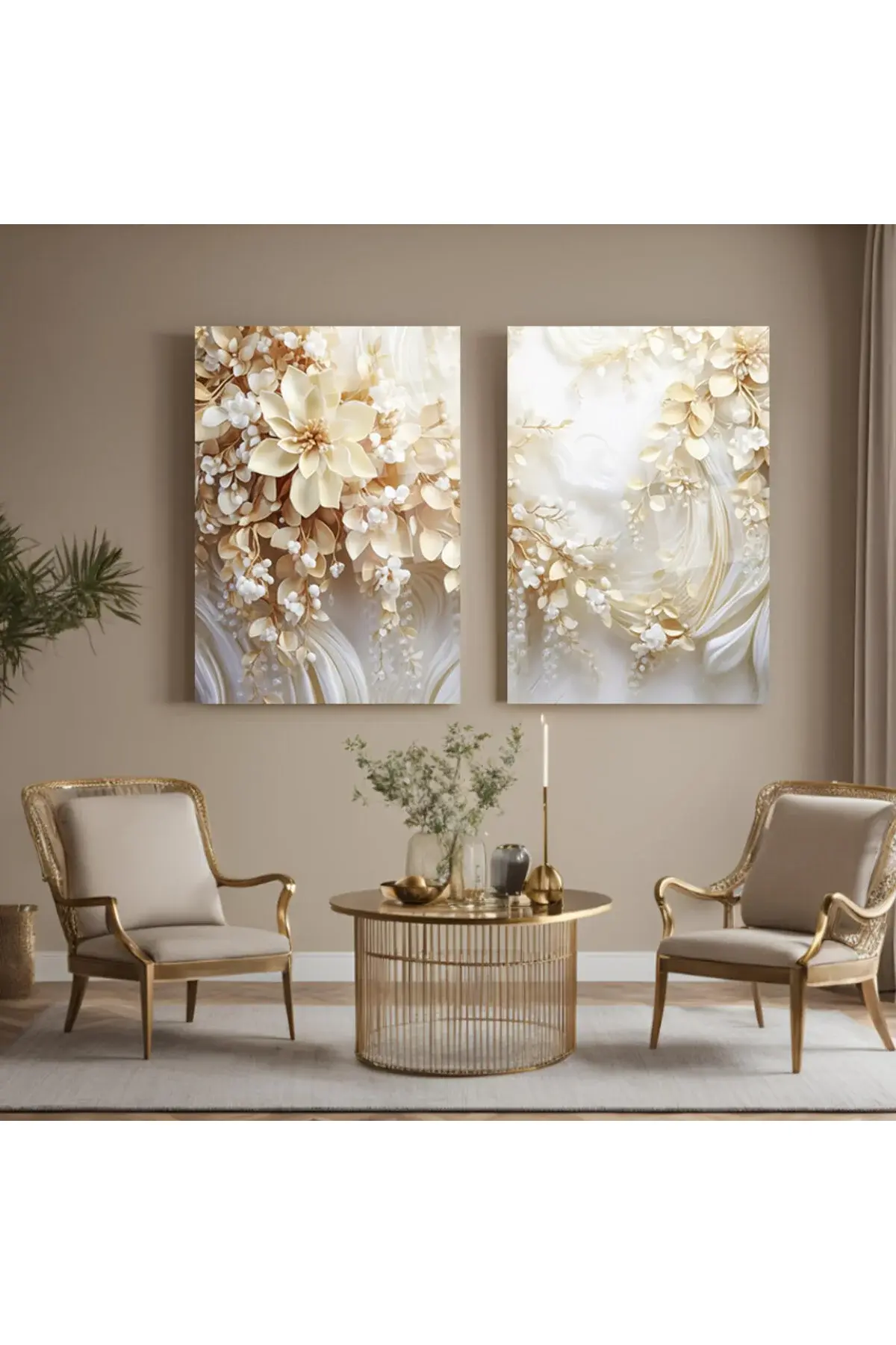 2 Lİ HARİKA BEYAZ ALTIN ÇİÇEKLER BOHEM TEMALI SET CAM TABLO KIRILMAZ CAM TABLO ULTRA CANLI RENKLER Beyaz
