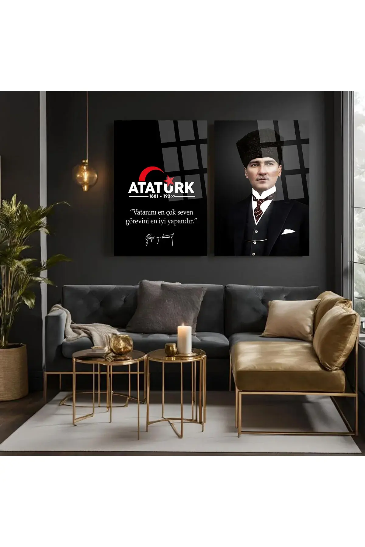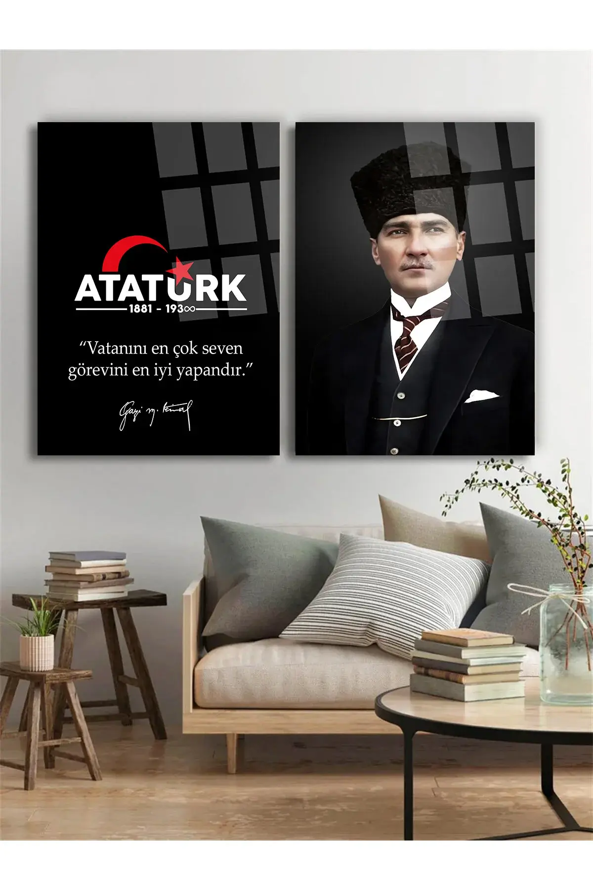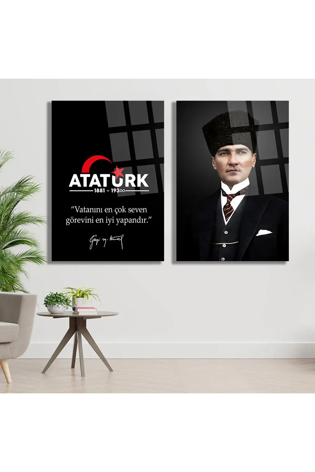2 PARÇA ATATÜRK MAKAM ODASI CAM TABLO ''Vatanını En Çok Seven Görevini En İyi Yapandır.'' Ofis Hediye Siyah