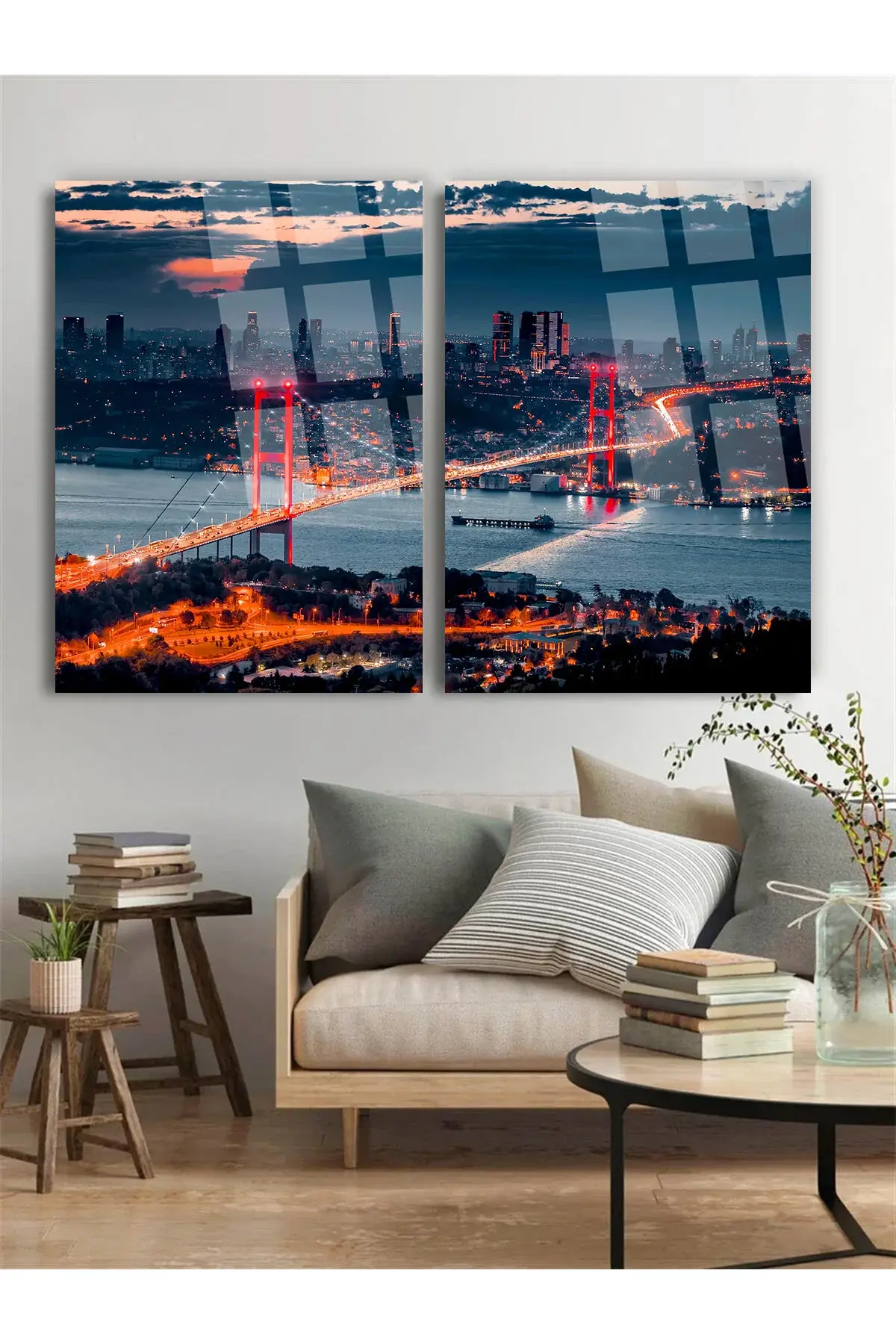 2 PARÇA HARİKA İSTANBUL MANZARASI SET MODERN TABLO ULTRA CANLI RENKLİ KIRILMAZ CAM TABLO EV HEDİYESİ Lacivert