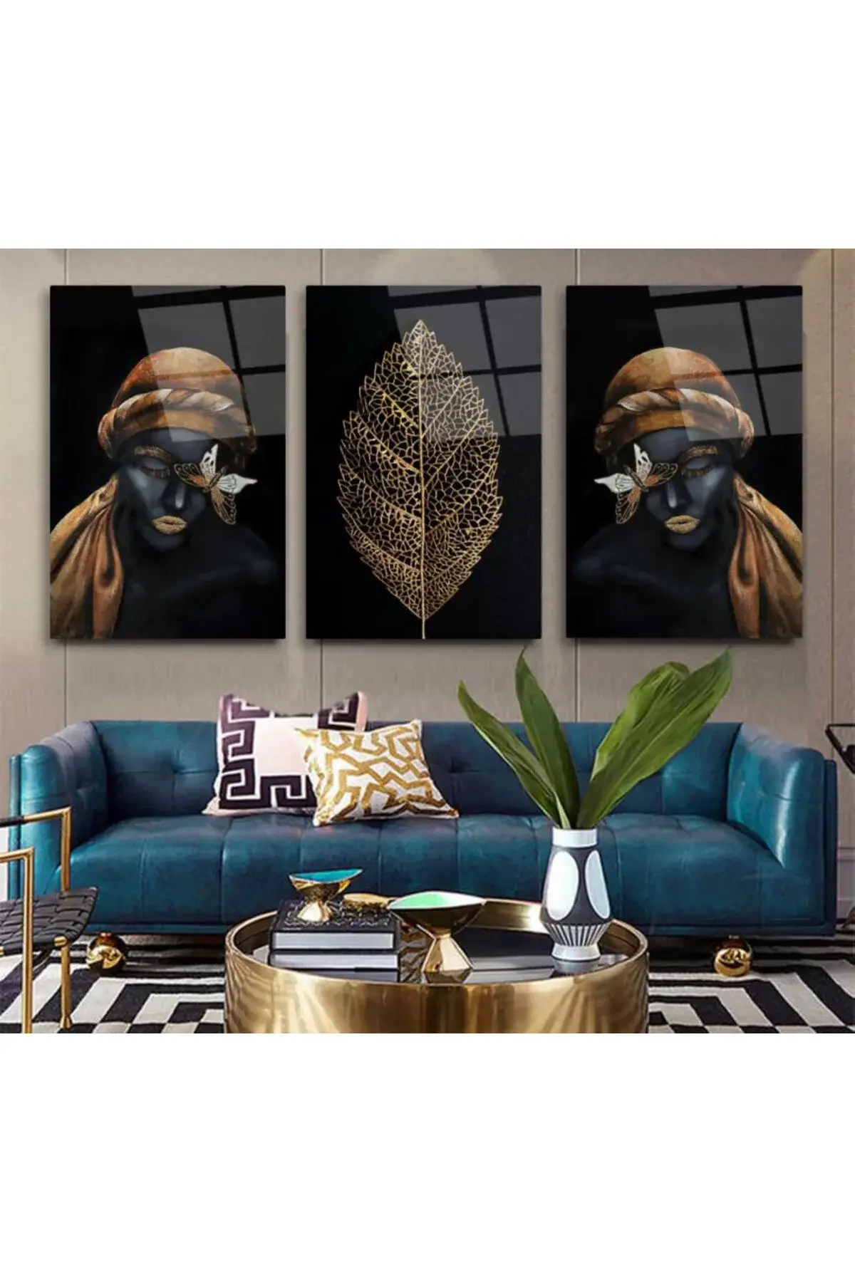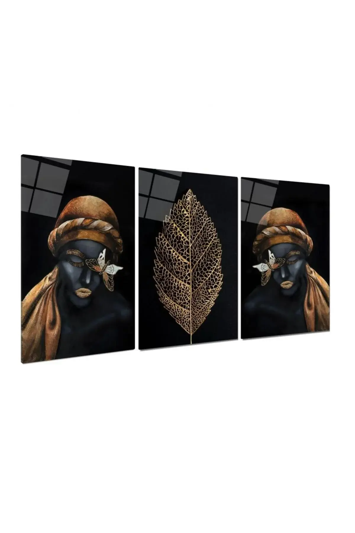 3 LÜ AFRİKALI KADIN VE TÜY UYUMU MODERN TASARIM KIRILMAZ CAM TABLO LÜKS TABLO EV HEDİYESİ Siyah