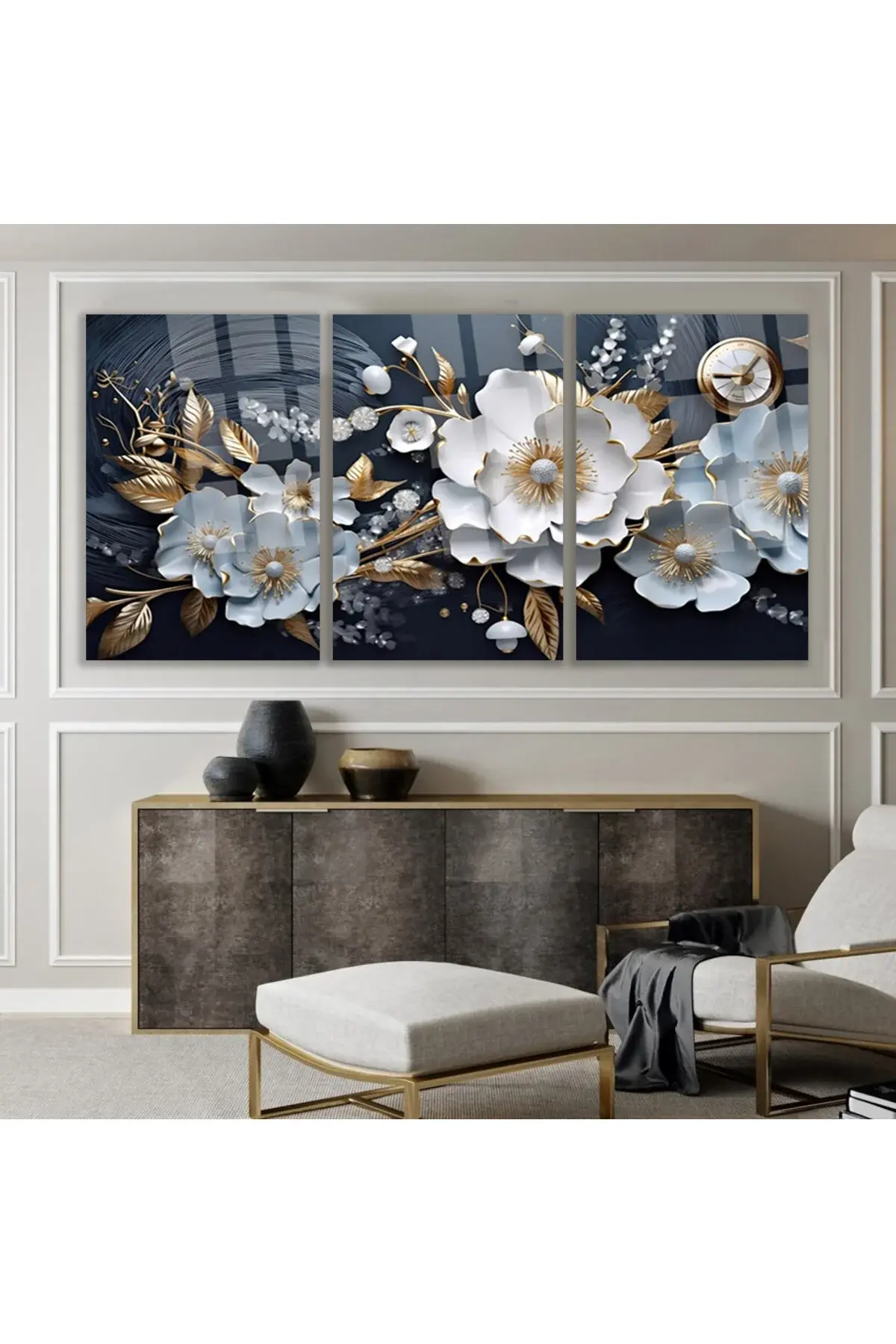 3 LÜ ALTIN ÇİÇEK TASARIMI KIRILMAZ CAM TABLO SALON TAKIMI TABLOSU EV HEDİYESİ Çok Renkli