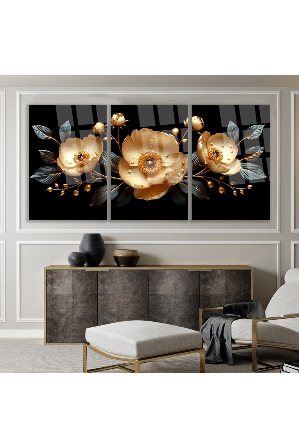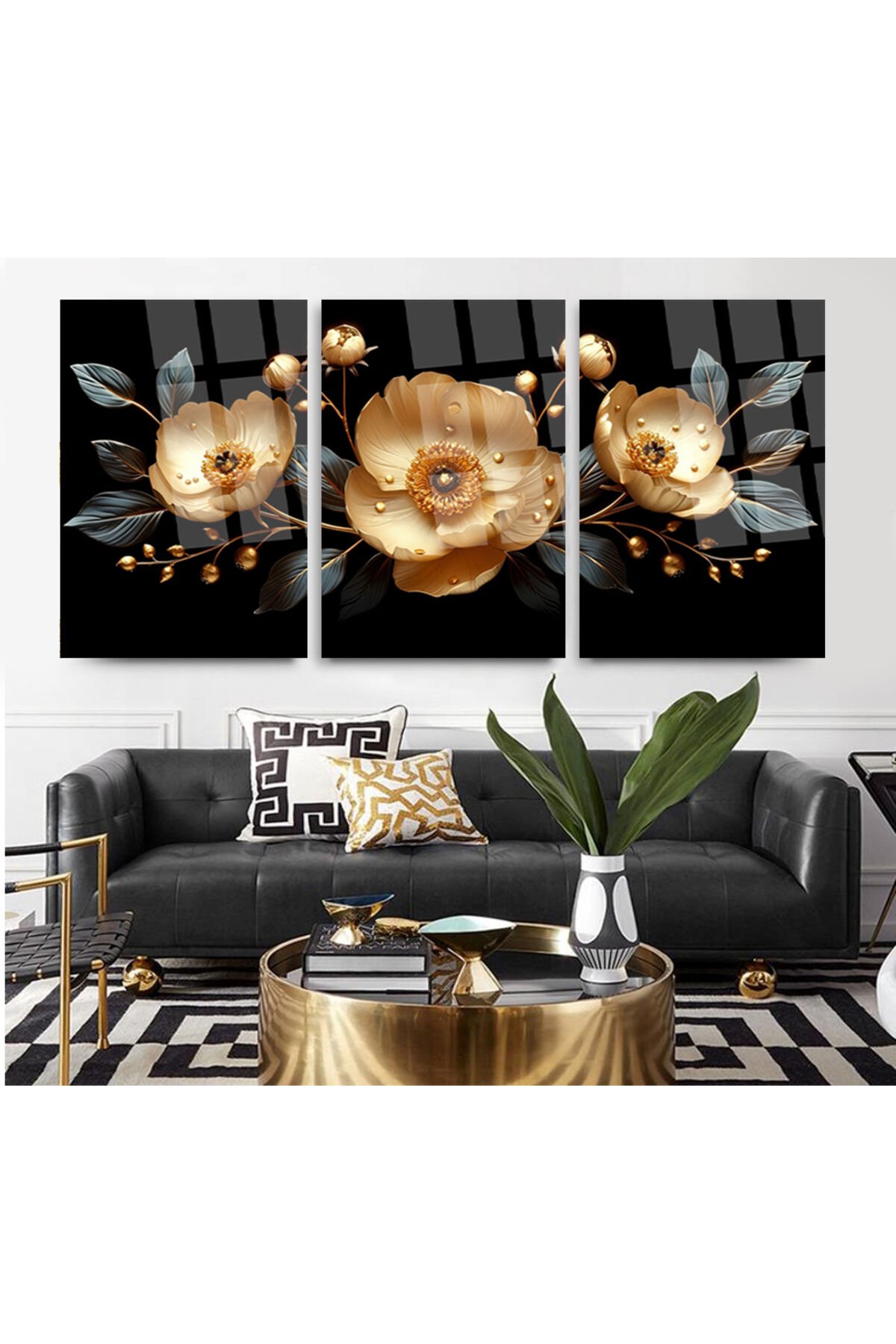 3 LÜ ALTIN ÇİÇEK TASARIMI KIRILMAZ CAM TABLO SALON TAKIMI TABLOSU EV HEDİYESİ Siyah