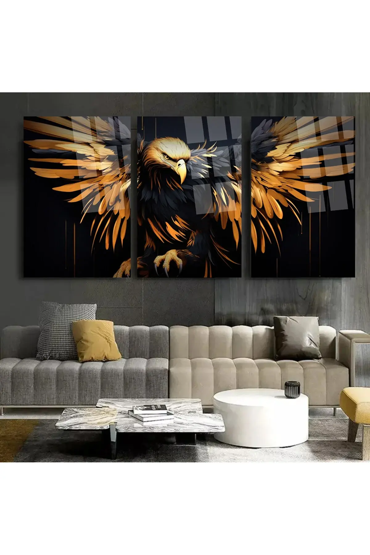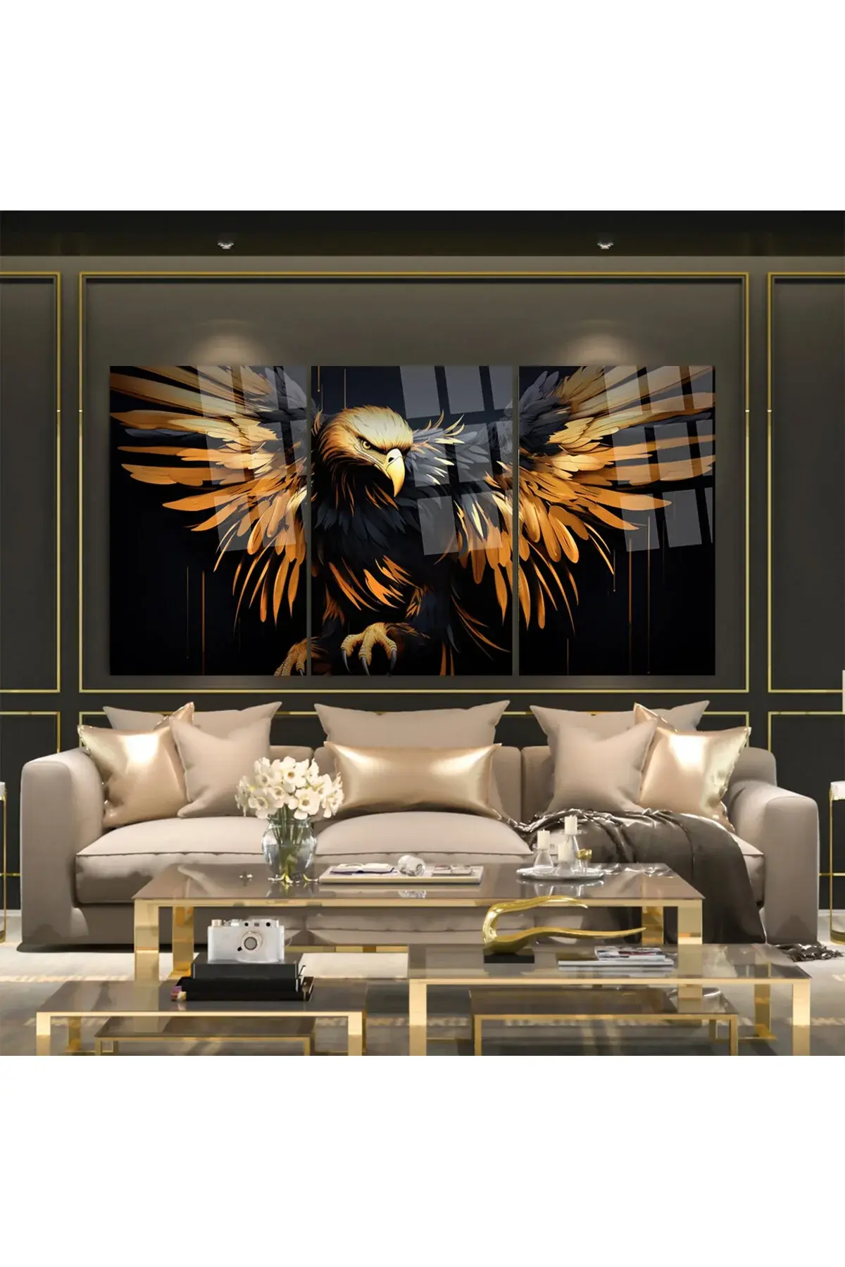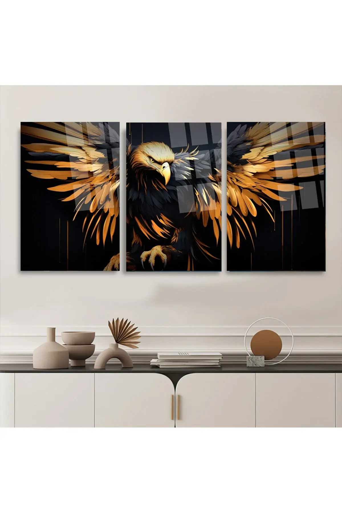 3 LÜ ALTIN KANATLI KARTAL TABLO SET CAM TABLO KIRILMAZ CAM TABLO ULTRA CANLI RENKLER Siyah