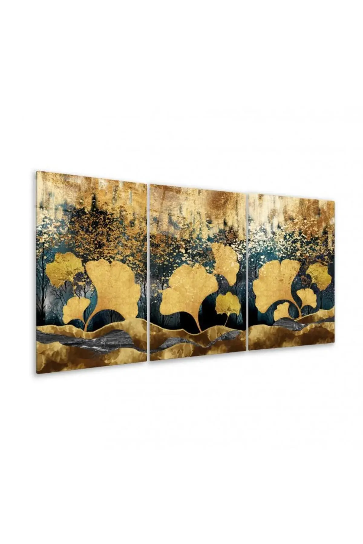 3 LÜ ALTIN YAPRAKLI CAM TABLO SETİ SALON TABLOSU EV HEDİYESİ KIRILMAZ CAM Kahverengi