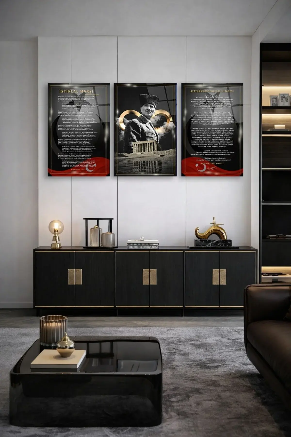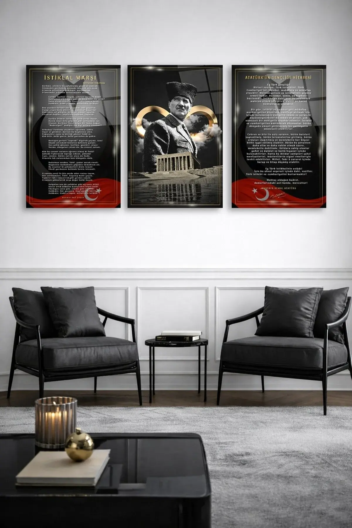 3 LÜ ATATÜRK KÖŞESİ İSTİKLAL MARŞI, ATATÜRK, GENÇLİĞE HİTABE SET TABLO TASARIMI KIRILMAZ CAM TABLO