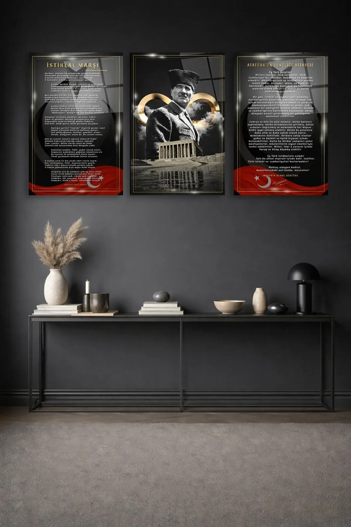 3 LÜ ATATÜRK KÖŞESİ İSTİKLAL MARŞI, ATATÜRK, GENÇLİĞE HİTABE SET TABLO TASARIMI KIRILMAZ CAM TABLO S5PXS261YS