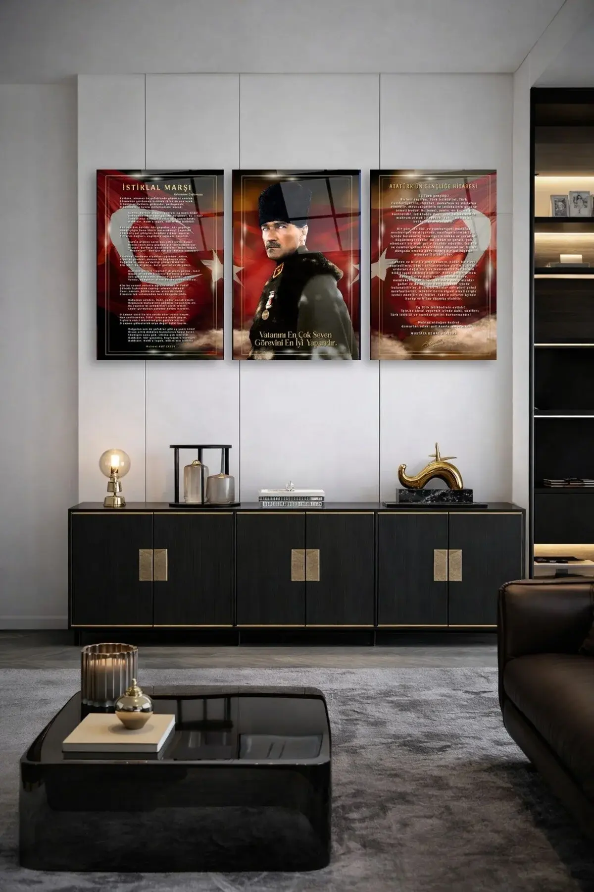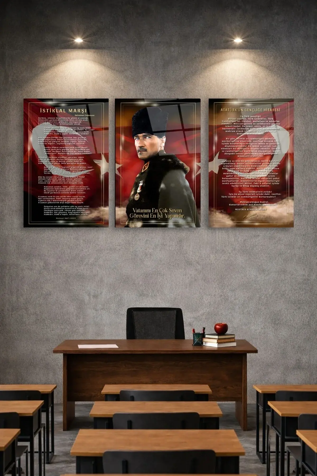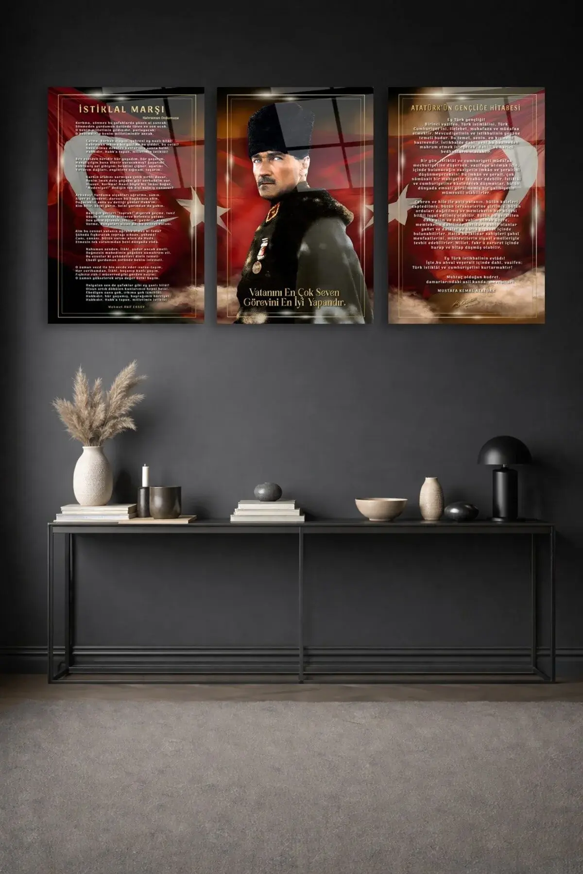 3 LÜ ATATÜRK KÖŞESİ İSTİKLAL MARŞI, ATATÜRK, GENÇLİĞE HİTABE SET TABLO TASARIMI KIRILMAZ CAM TABLO