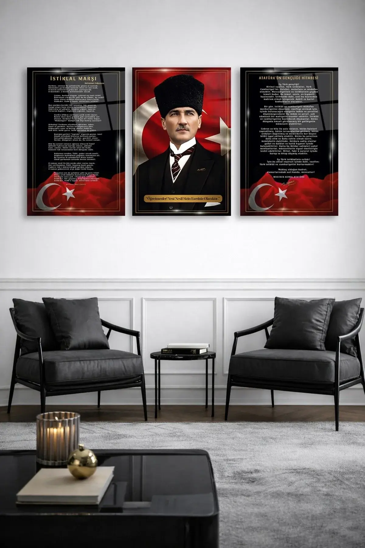 3 LÜ ATATÜRK KÖŞESİ İSTİKLAL MARŞI, ATATÜRK, GENÇLİĞE HİTABE SET TABLO TASARIMI KIRILMAZ CAM TABLO