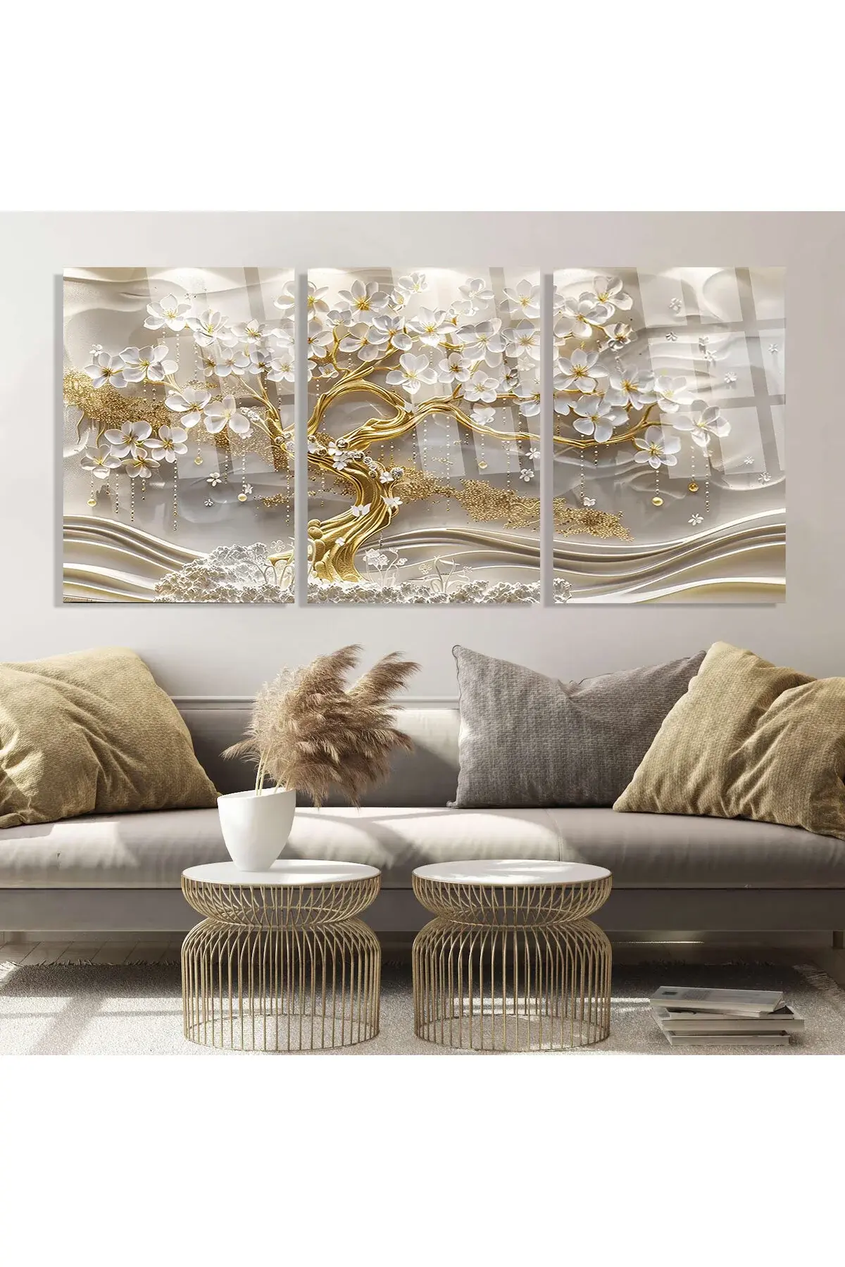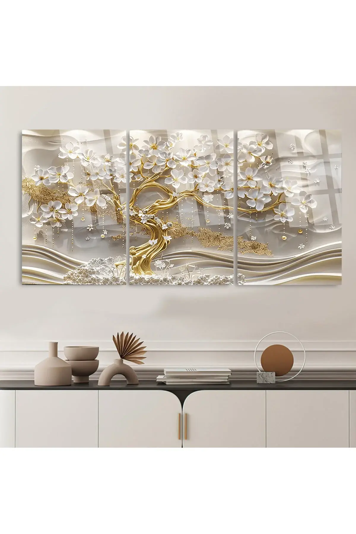 3 LÜ BEYAZ ALTIN KÖLÜ AĞAÇ TASARIM TABLO MODERN CAM TABLO KIRILMAZ LÜKS EV HEDİYESİ TABLO Beyaz