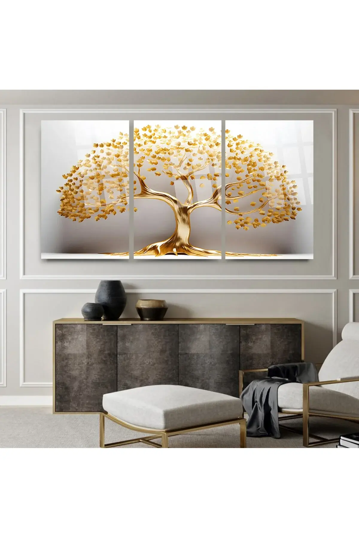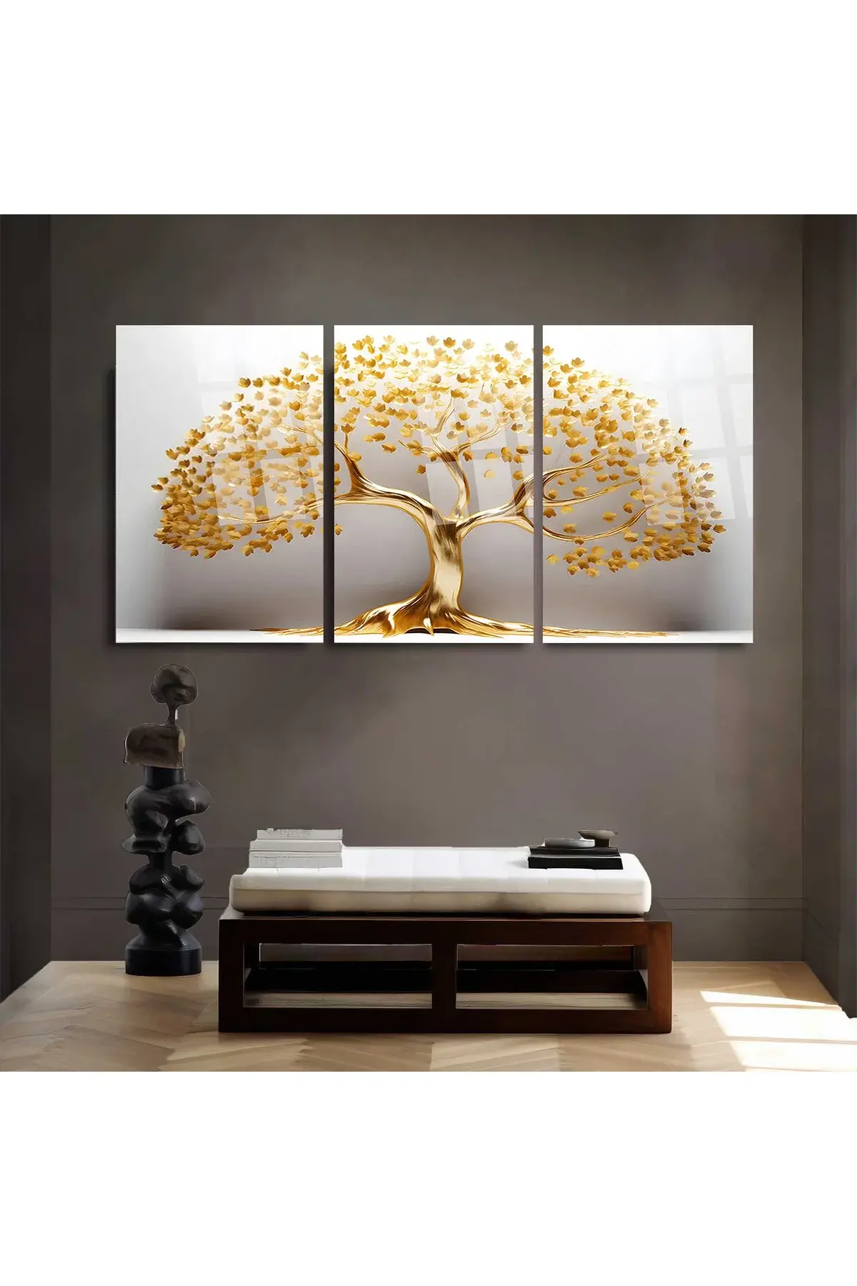 3 LÜ BEYAZ ARKA TEMA ALTIN AĞAÇ TASARIM CAM TABLO KIRILMAZ CAM TABLO ULTRA CANLI RENKLER Sarı