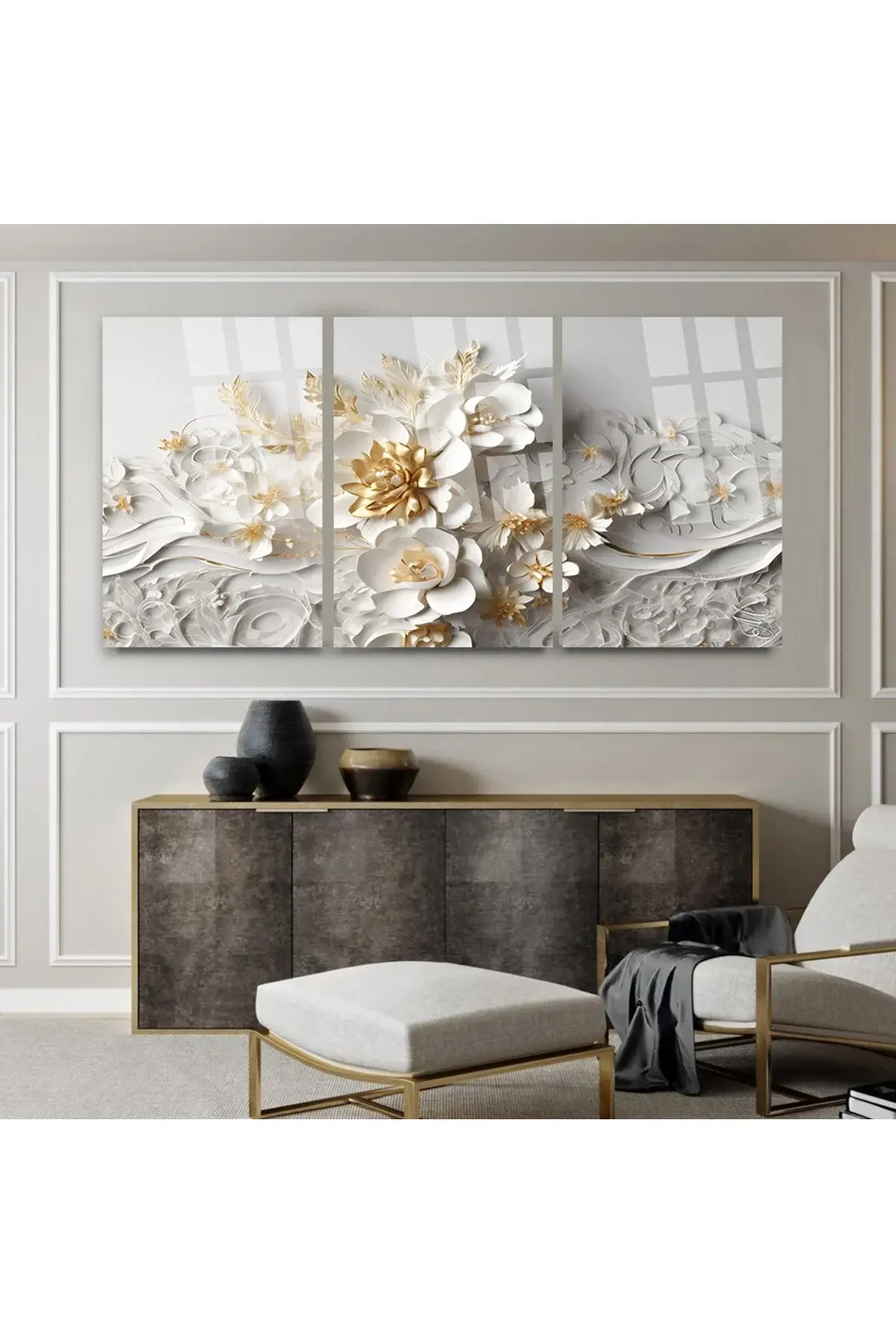 3 LÜ BEYAZ ÇİÇEK ALTIN LOTUS DETAYLI TASARIM TABLO MODERN CAM TABLO KIRILMAZ LÜKS EV HEDİYESİ TABLO Beyaz
