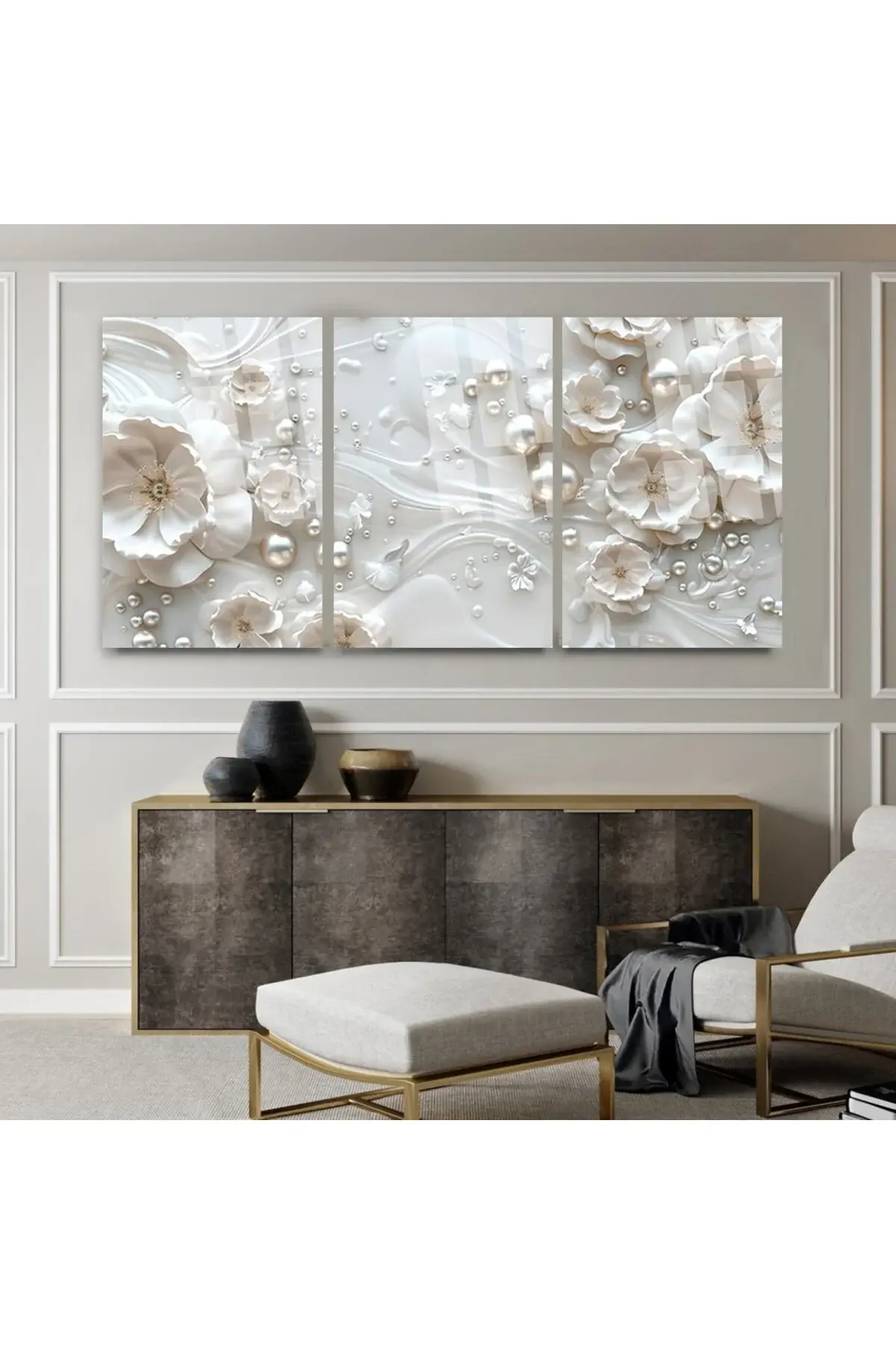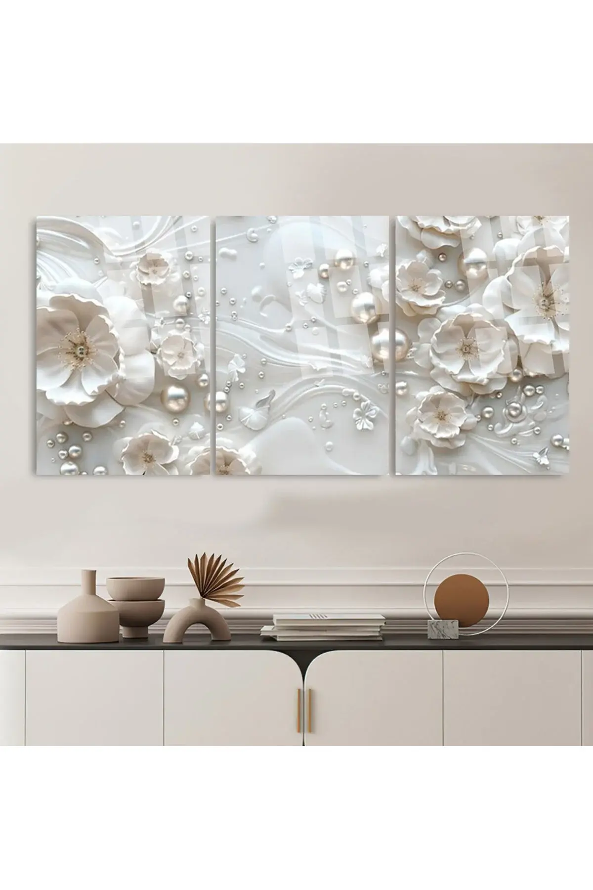 3 LÜ BEYAZ ÇİÇEK BONCUKLU TABLO MODERN CAM TABLO KIRILMAZ LÜKS EV HEDİYESİ TABLO Beyaz