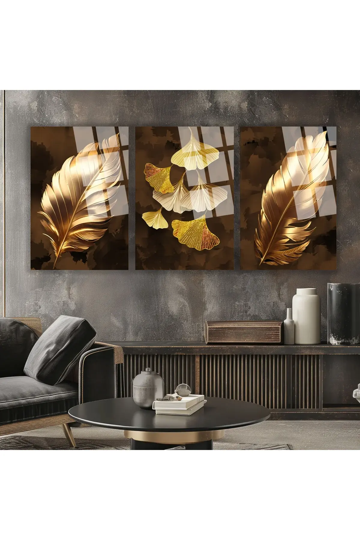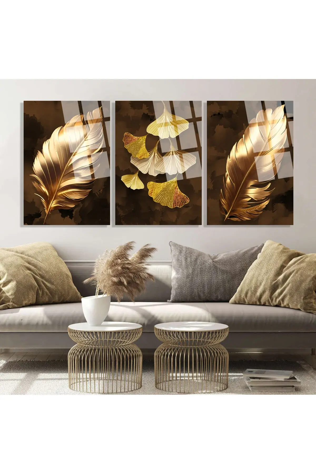 3 LÜ BOHEM ODA TABLOSU ALTIN YAPRAKLAR KIRILMAZ CAM TABLO LÜKS TABLO EV HEDİYESİ Kahverengi