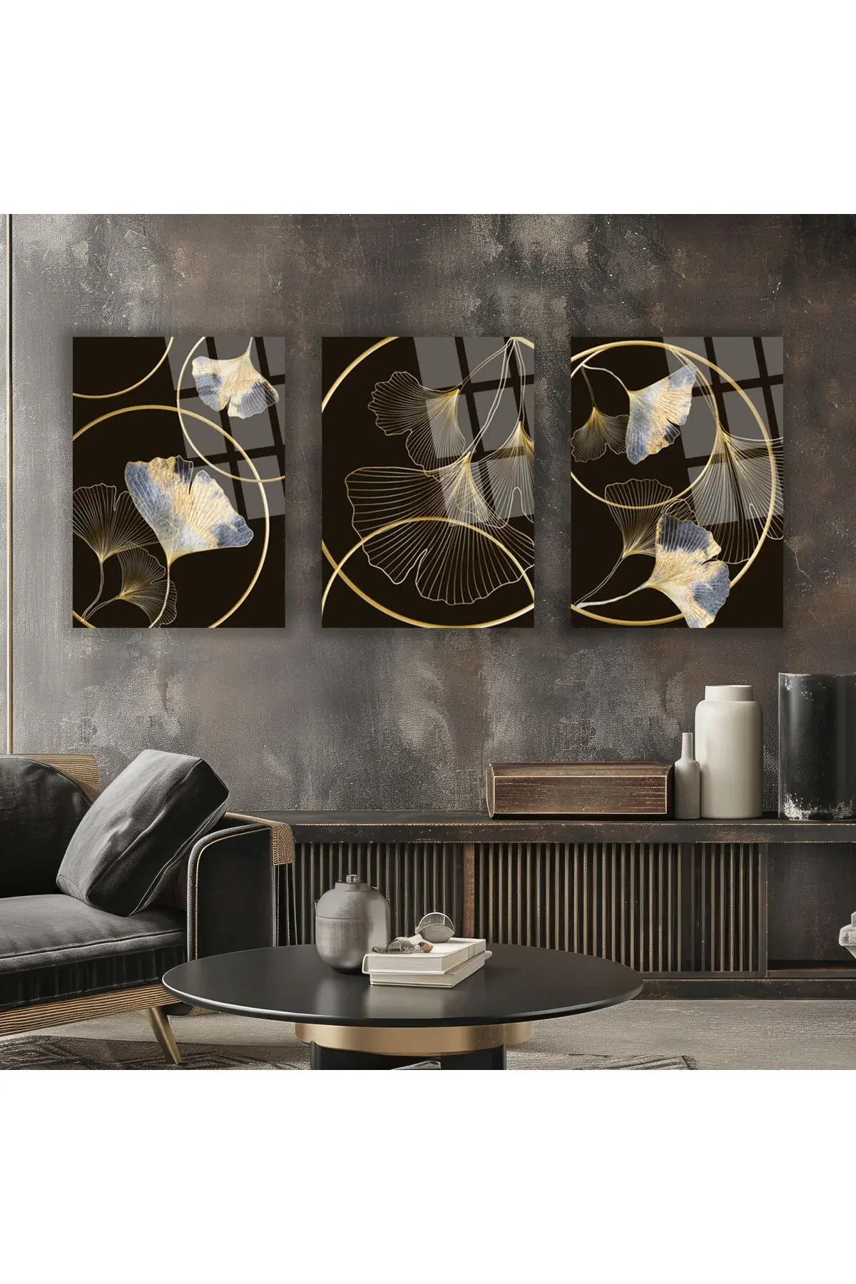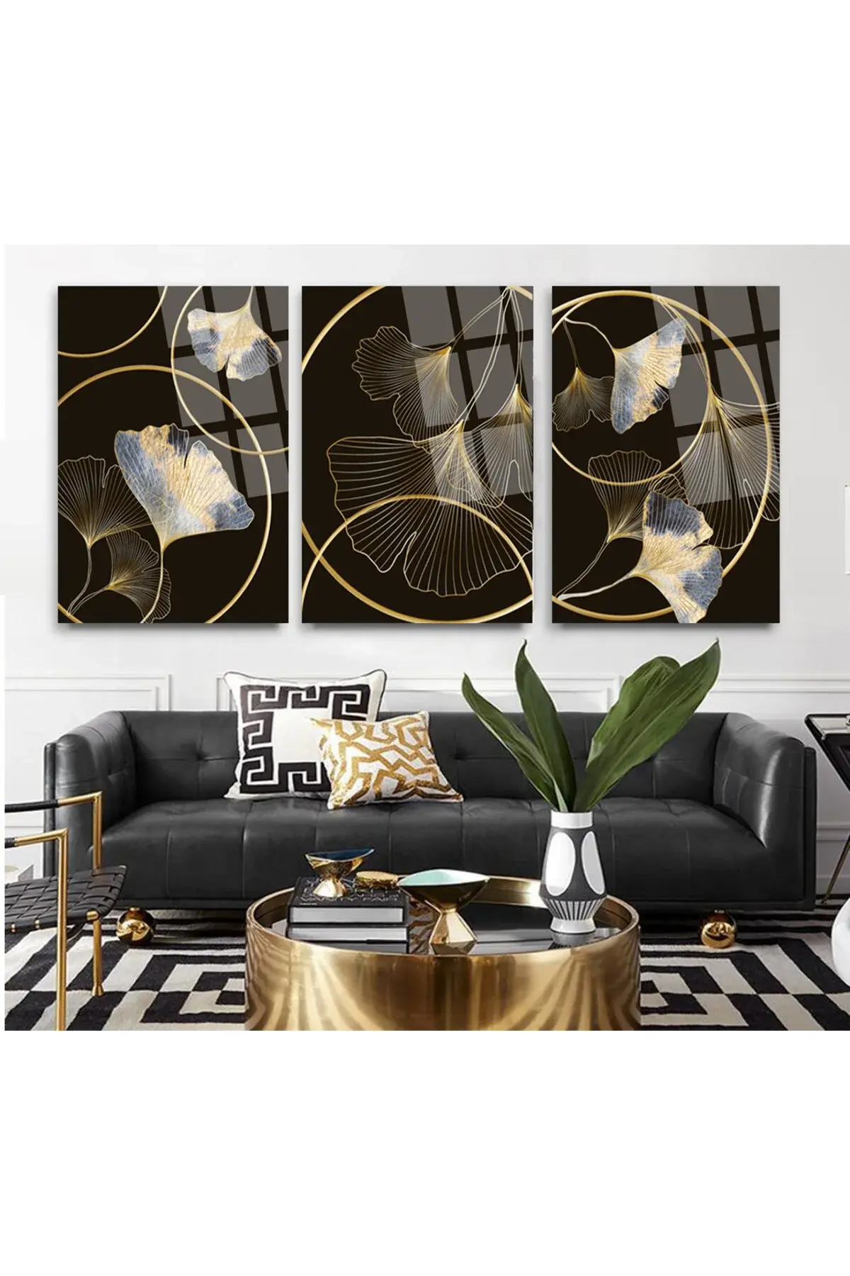 3 LÜ ÇARK VE ÇİÇEK TASARIMLI HARİKA CAM TABLO SETİ SALON TABLOSU EV HEDİYESİ KIRILMAZ CAM Siyah