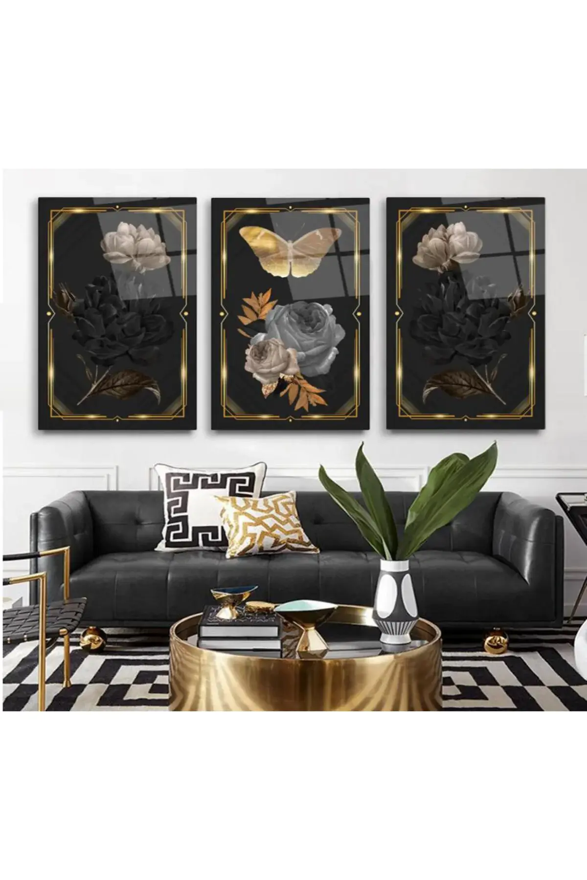 3 LÜ ÇİÇEKLER VE KELEBEK DETAY KIRILMAZ CAM TABLO ULTRA CANLI RENKLİ MODERN EV HEDİYESİ Siyah