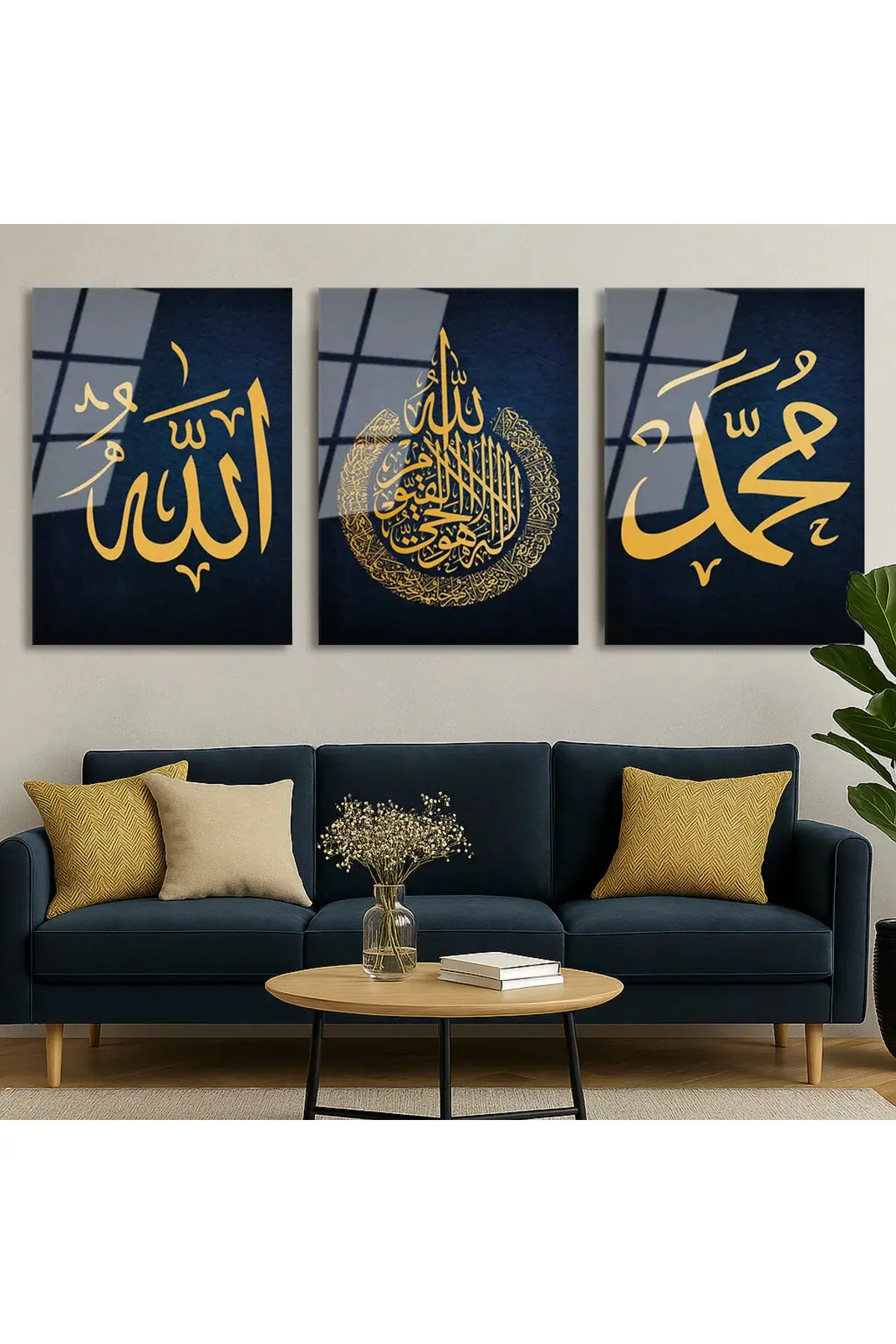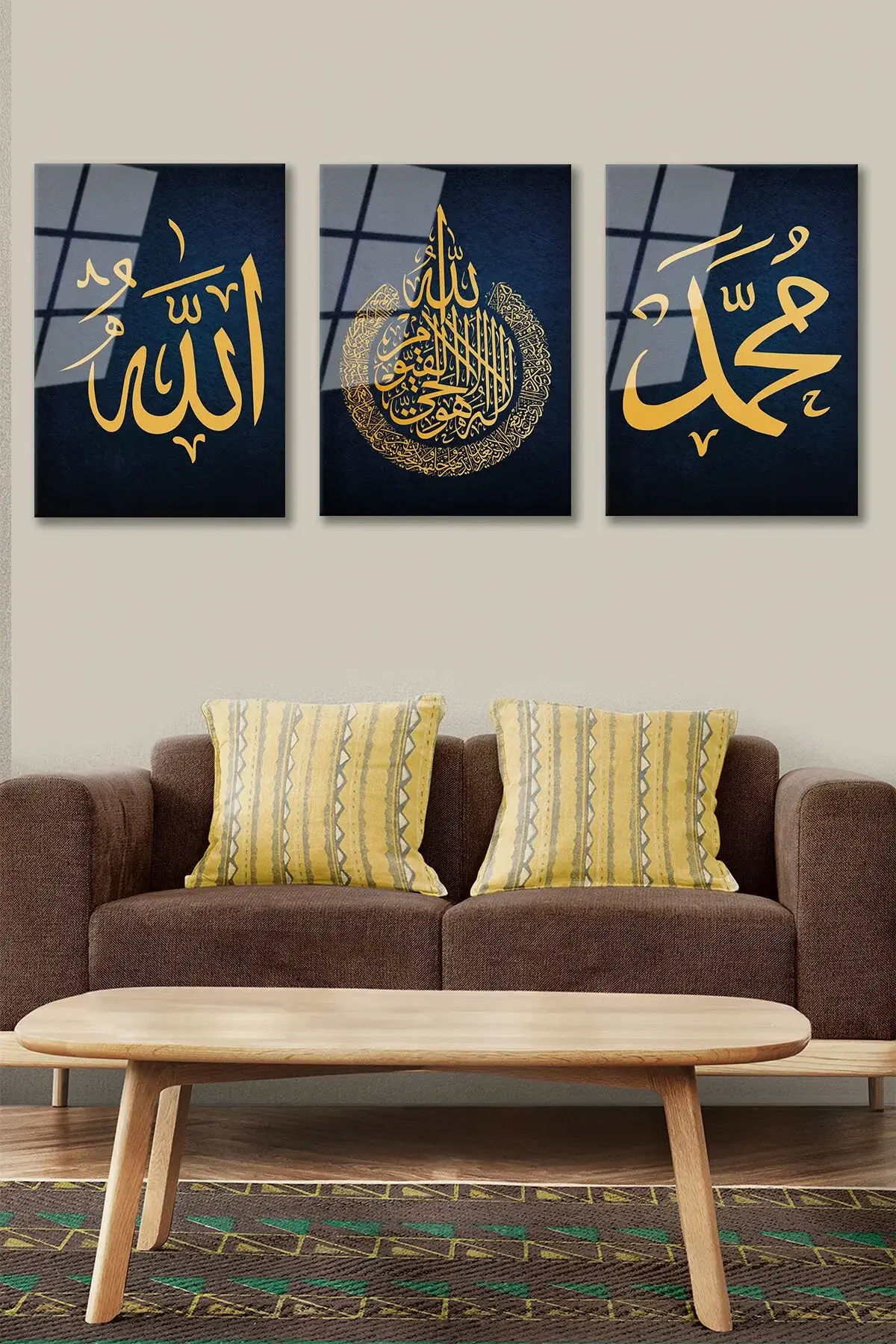 3 LÜ DİNİ İSLAMİ TABLO ALLAH, AYETEL KÜRSİ, MUHAMMED YAZILI KIRILMAZ CAM TABLO SETİ EV HEDİYESİ Lacivert