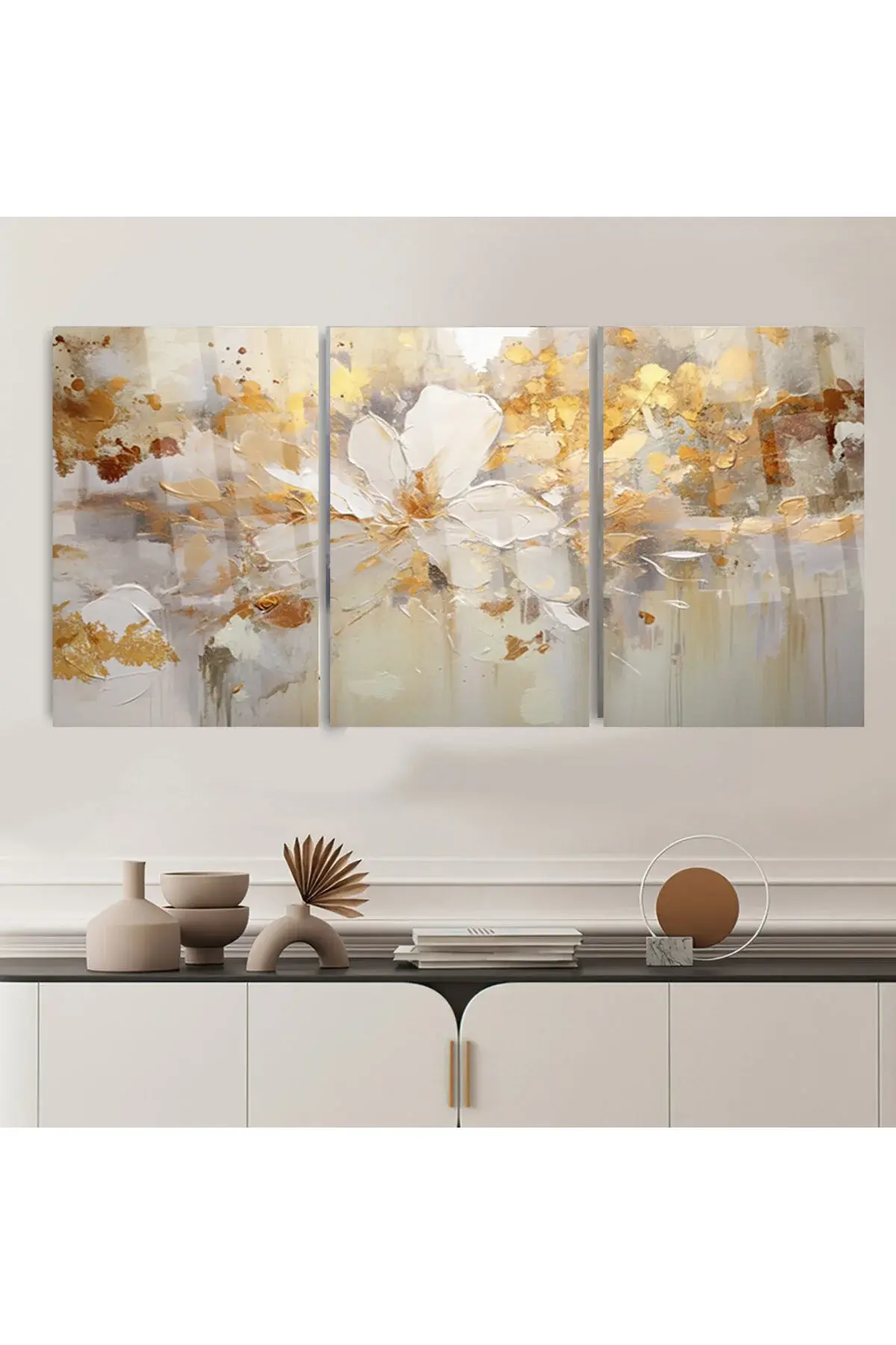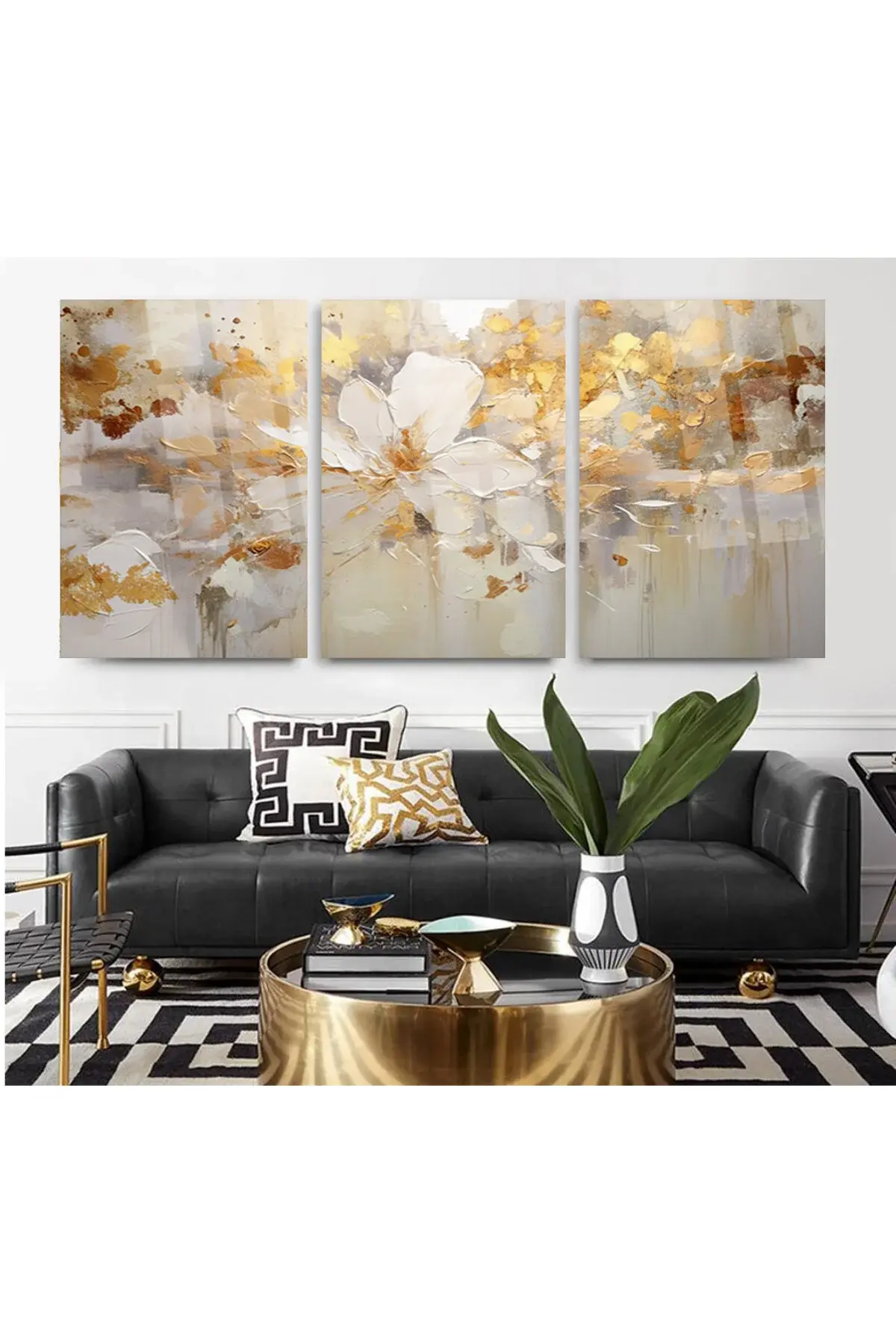 3 LÜ FIRÇA DARBELERİ ALTIN ÇİÇEK TASARIMI KIRILMAZ CAM TABLO ULTRA CANLI RENKLER EV HEDİYESİ Bej