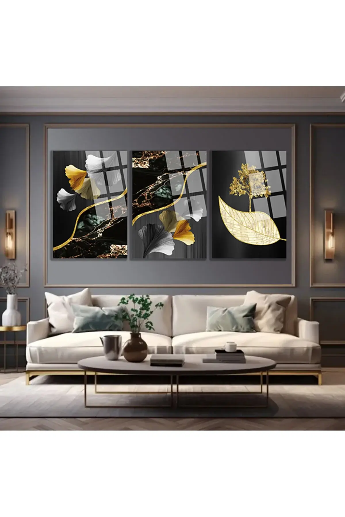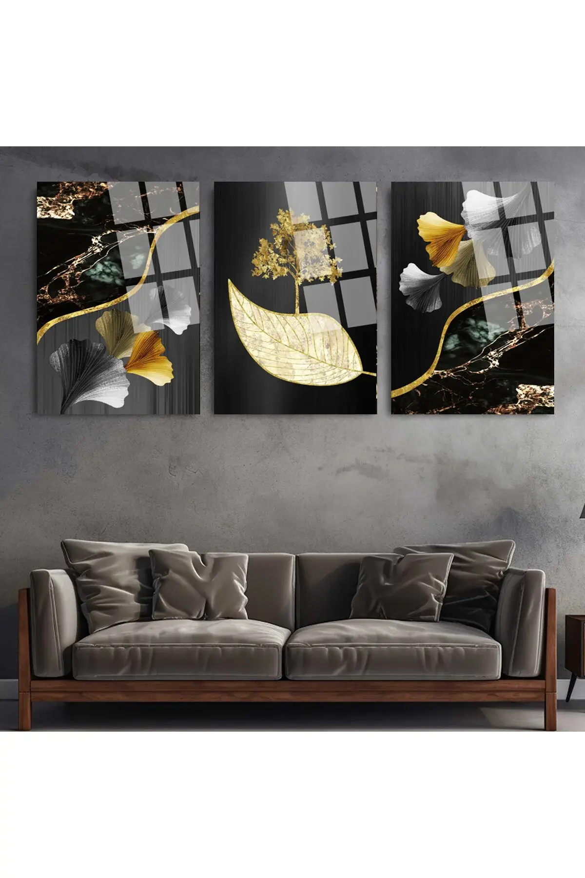3 LÜ GEOMETRİK DESENLER VE ÇİÇEK TABLOSU PARÇALI SET TABLO KIRILMAZ LÜKS CAM TABLO EV HEDİYESİ Siyah