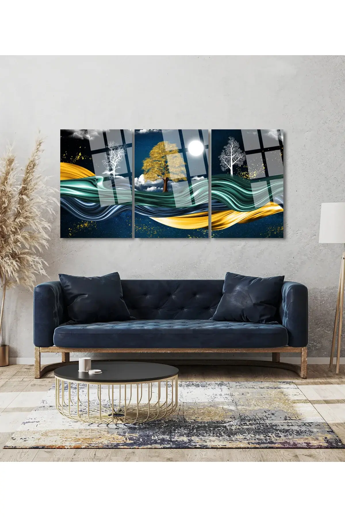 3 LÜ GOLD DETAYLI MANZARALI PARÇALI SET TABLO KIRILMAZ LÜKS CAM TABLO EV HEDİYESİ Lacivert