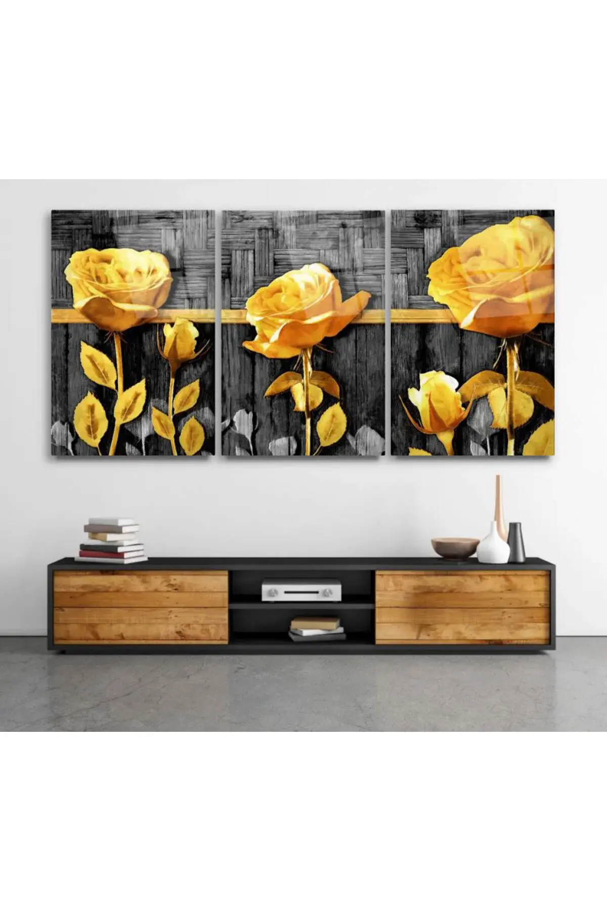 3 LÜ GRİ RETRO TEMA ALTIN ÇİÇEKLER MODERN TASARIM KIRILMAZ CAM TABLO LÜKS TABLO EV HEDİYESİ Sarı