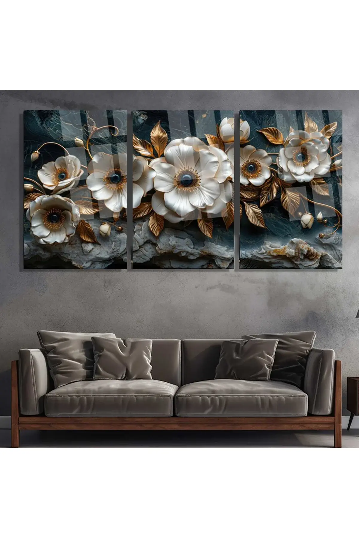 3 LÜ HARİKA ÇİÇEK TASARIMI CAM TABLO KIRILMAZ CAM TABLO ULTRA CANLI RENKLER EV HEDİYESİ Lacivert