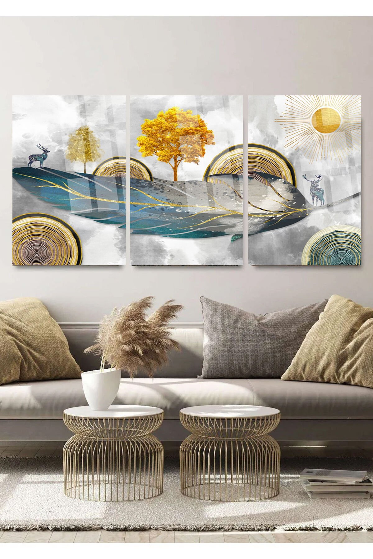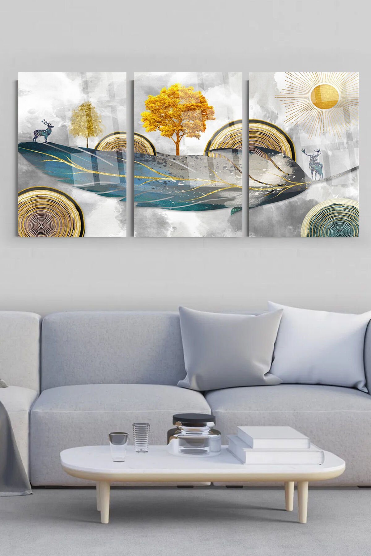 3 Lü Harika Doğa Tasarımı Gold Detaylı Cam Tablo Parçalı Tasarım Ev Hediyesi Salon İçin Tablo Metalik