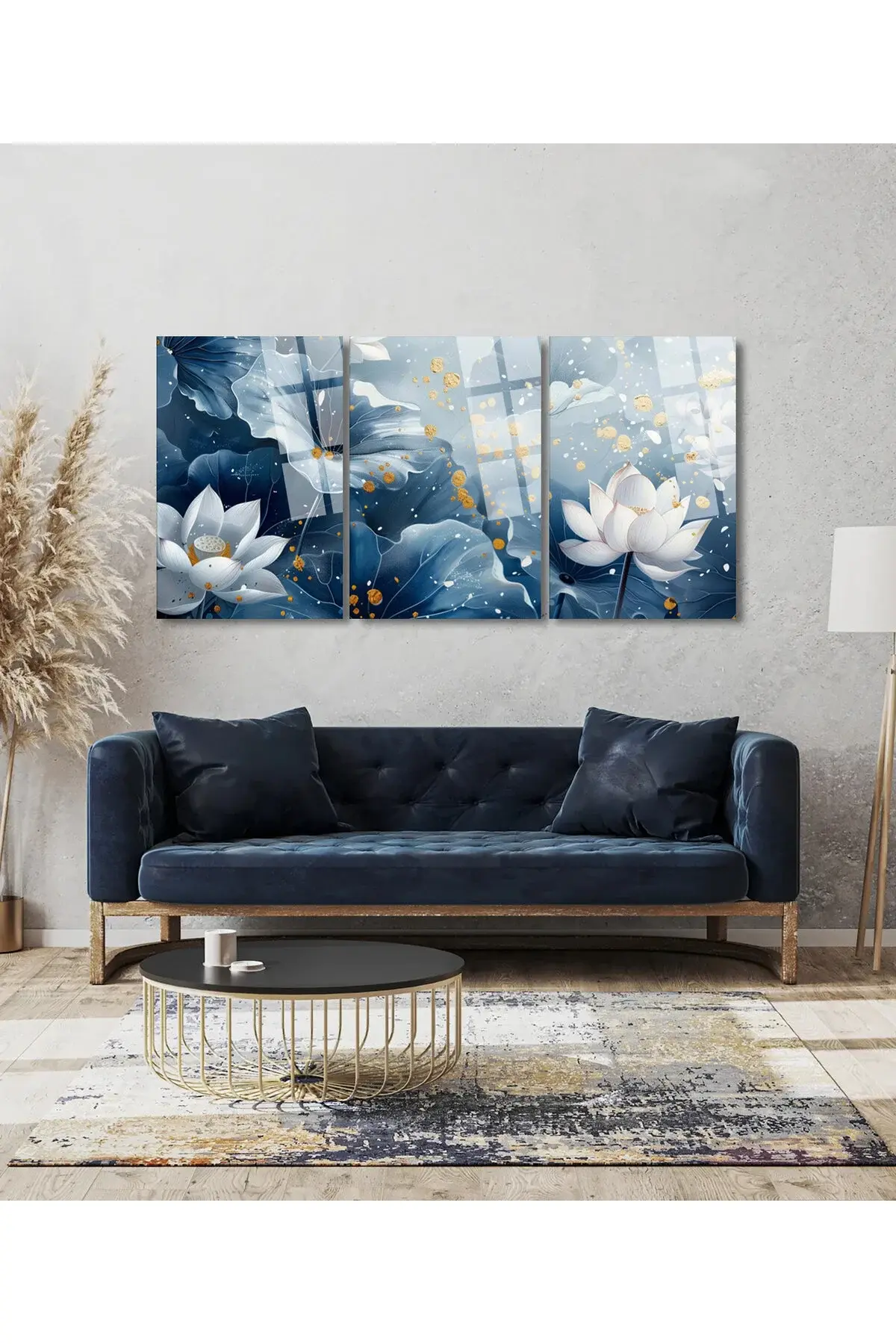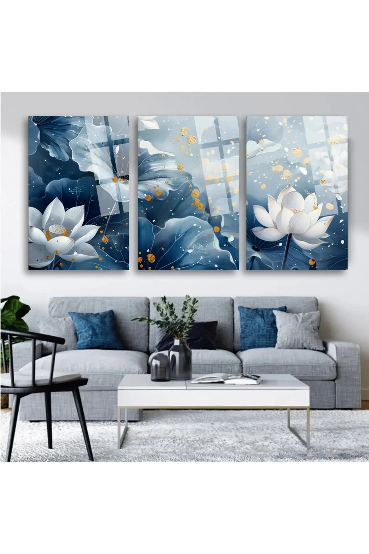 3 LÜ HARİKA RENK UYUMU ÇİÇEKLER PARÇALI SET TABLO KIRILMAZ LÜKS CAM TABLO EV HEDİYESİ Mavi