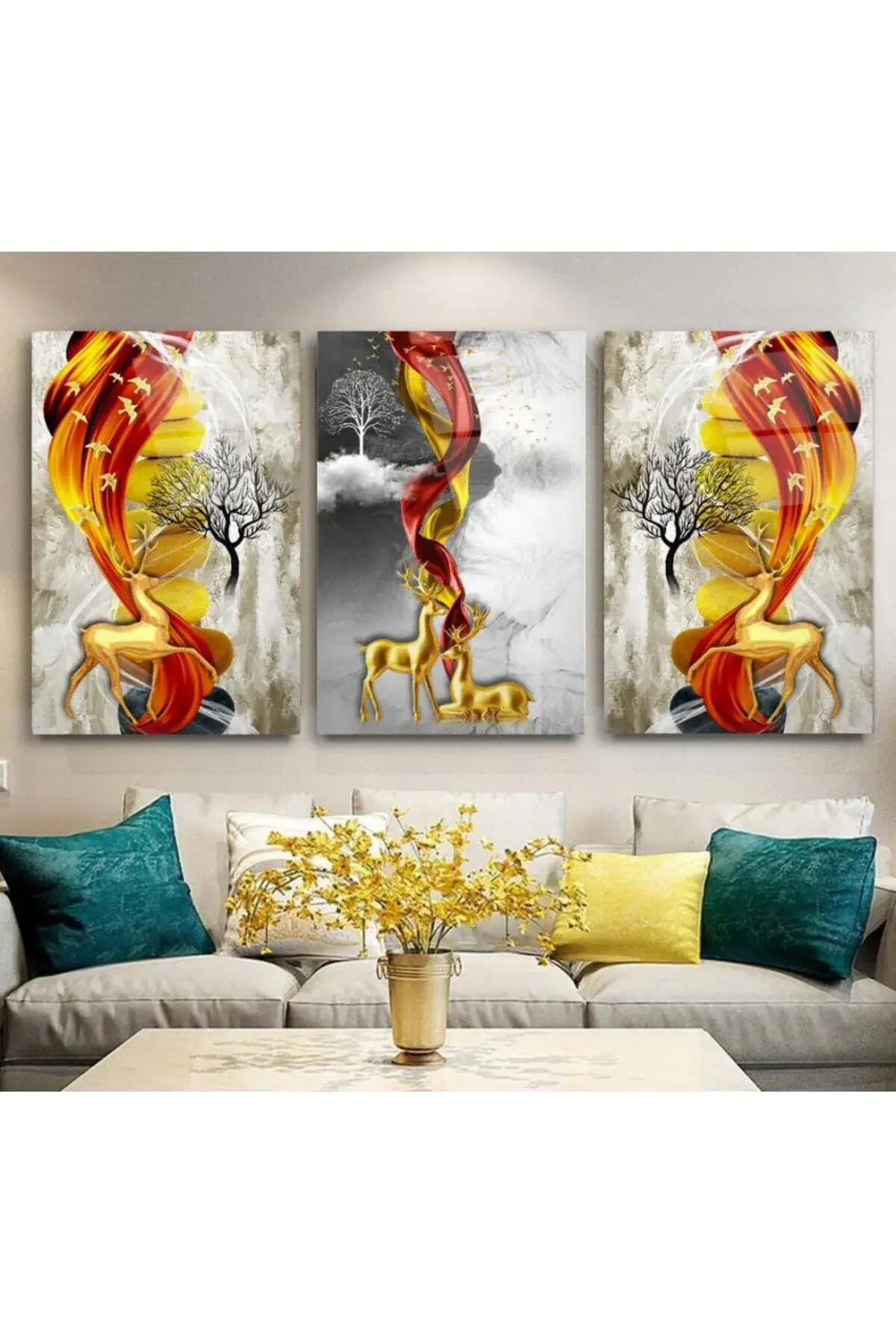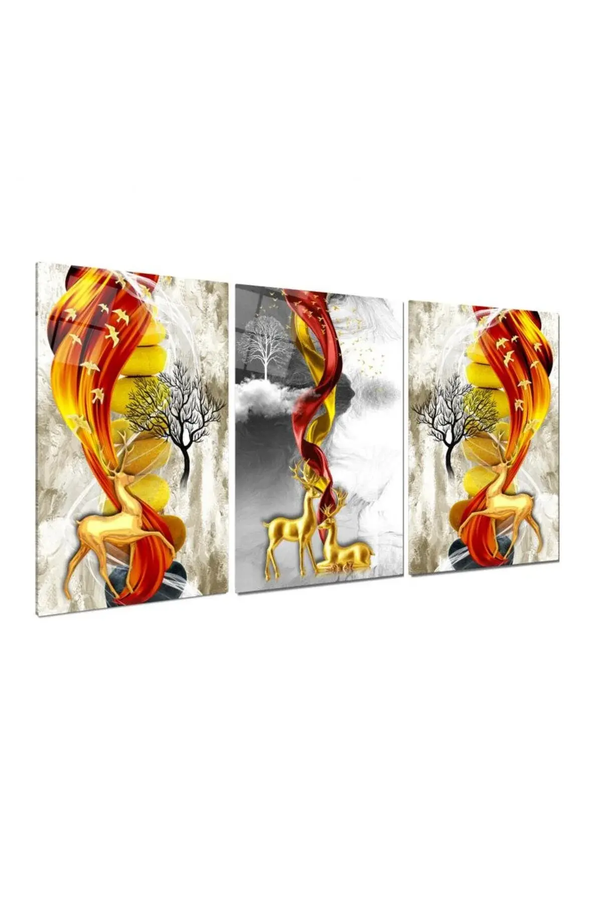 3 LÜ HARİKA RENK UYUMU GEYİK TEMALI MODERN TASARIM KIRILMAZ CAM TABLO LÜKS TABLO EV HEDİYESİ Turuncu