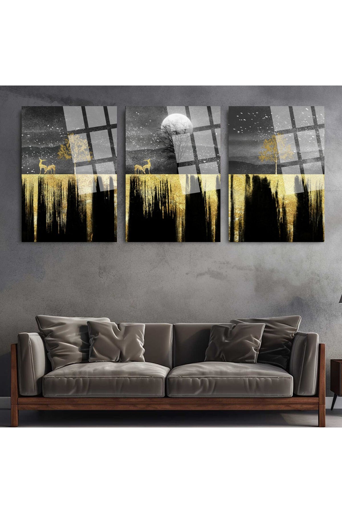 3 LÜ HARİKA UYUM SİYAH TEMA ALTIN YAPRAK TABLO PARÇALI SET TABLO KIRILMAZ LÜKS CAM TABLO EV HEDİYESİ