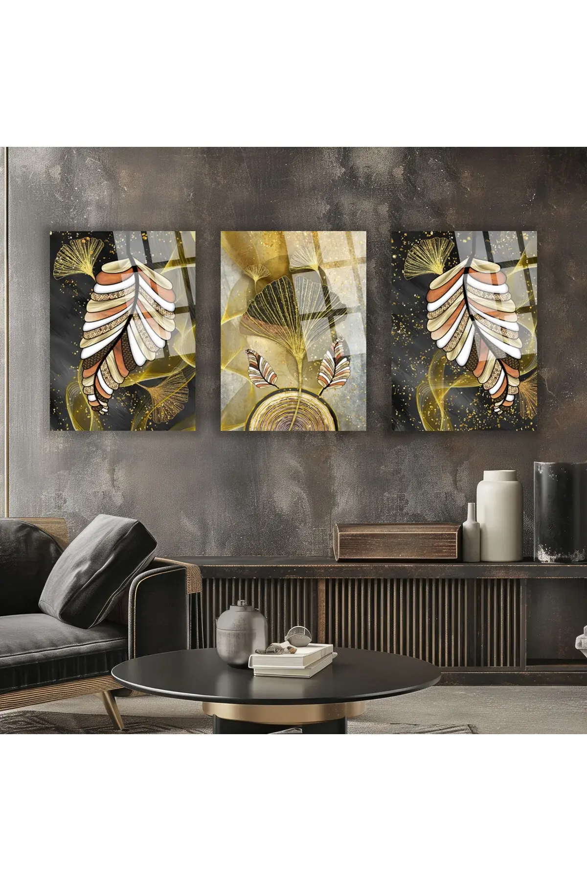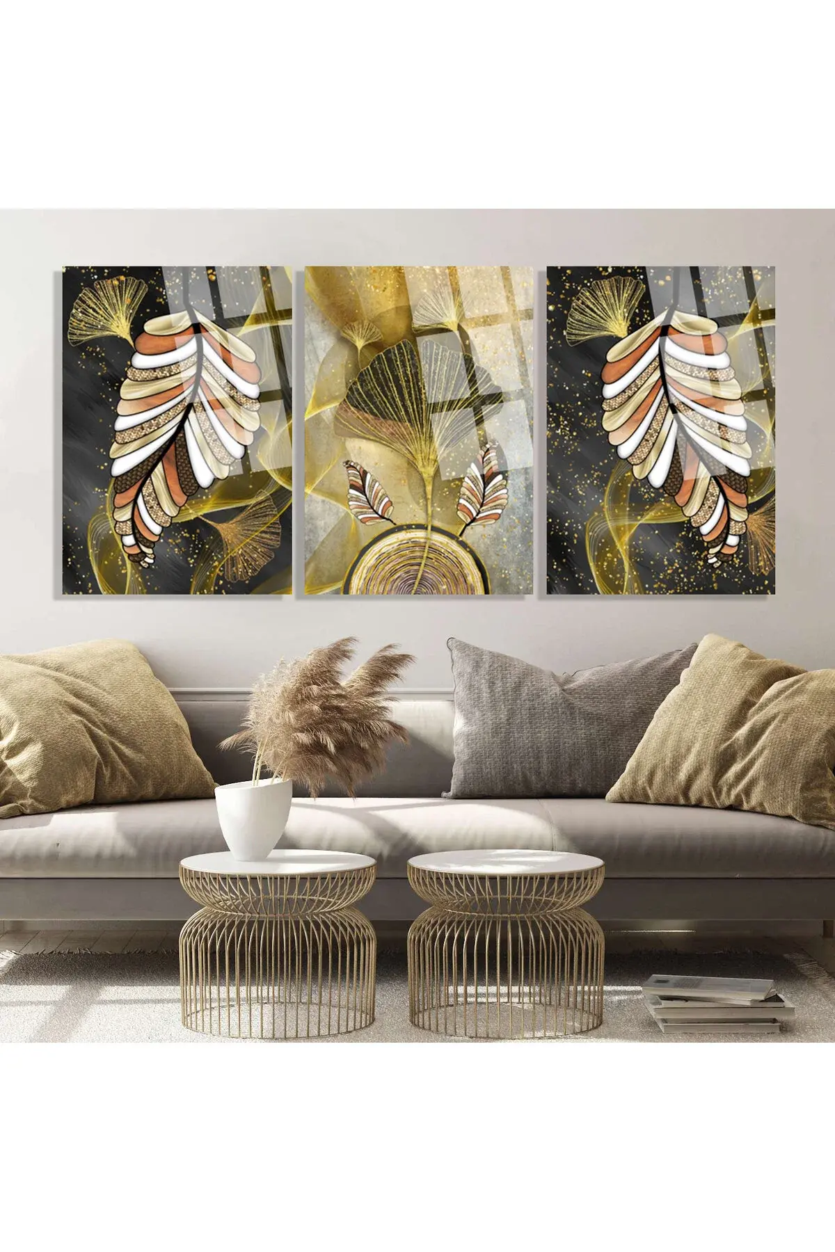 3 LÜ HARİKA UYUMLU RENKLER VE ALTIN DETAYLI TASARIM KIRILMAZ CAM TABLO LÜKS TABLO EV HEDİYESİ Bej