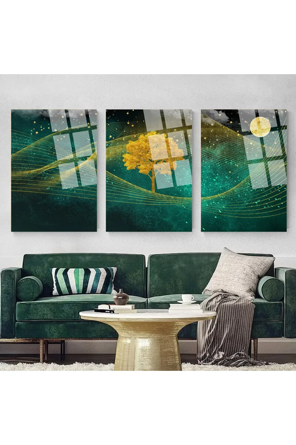 3 LÜ IŞIK SAÇAN ÇİZGİLER VE MANZARA SET CAM TABLO KIRILMAZ CAM TABLO ULTRA CANLI RENKLER Yeşil