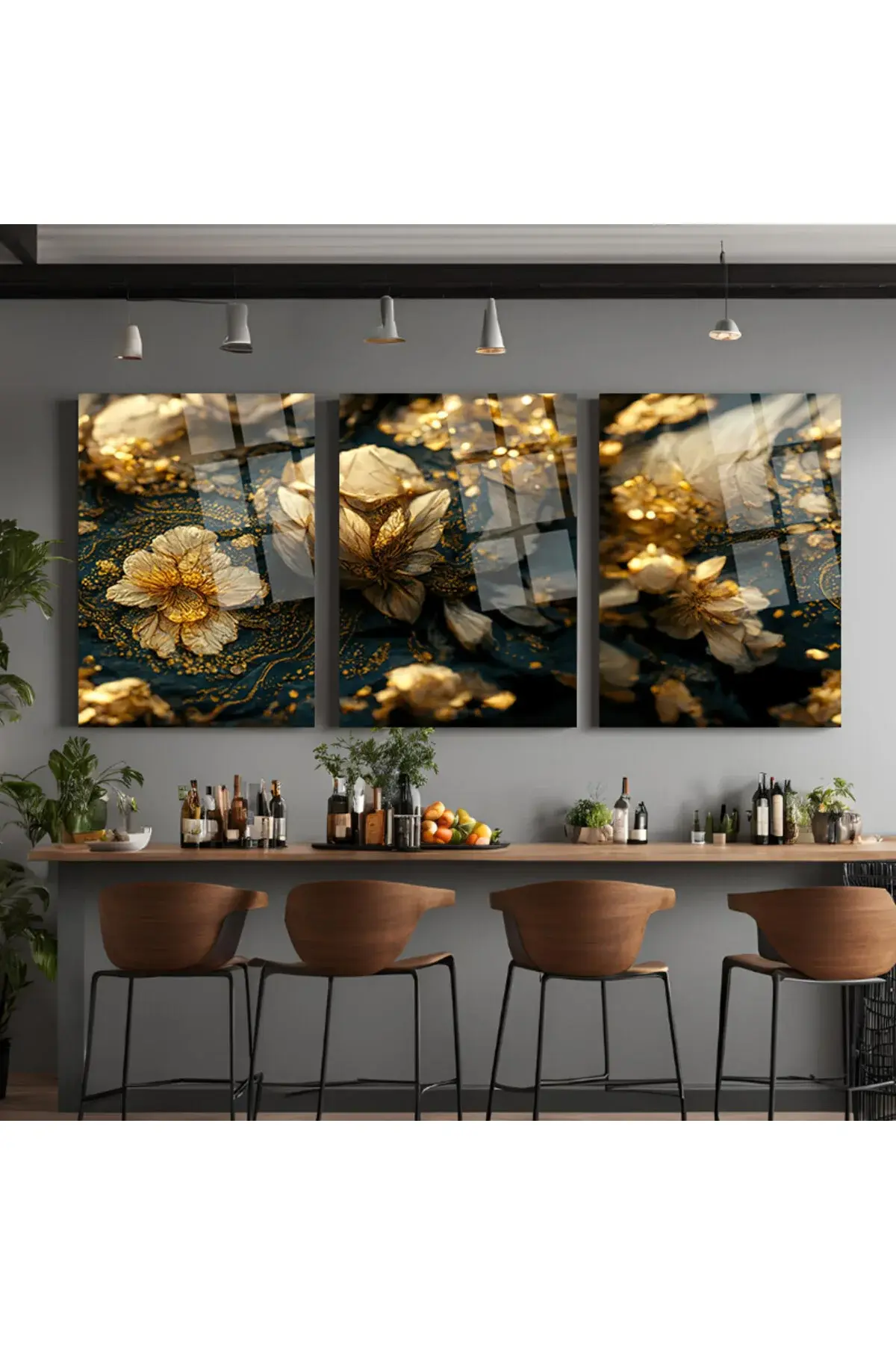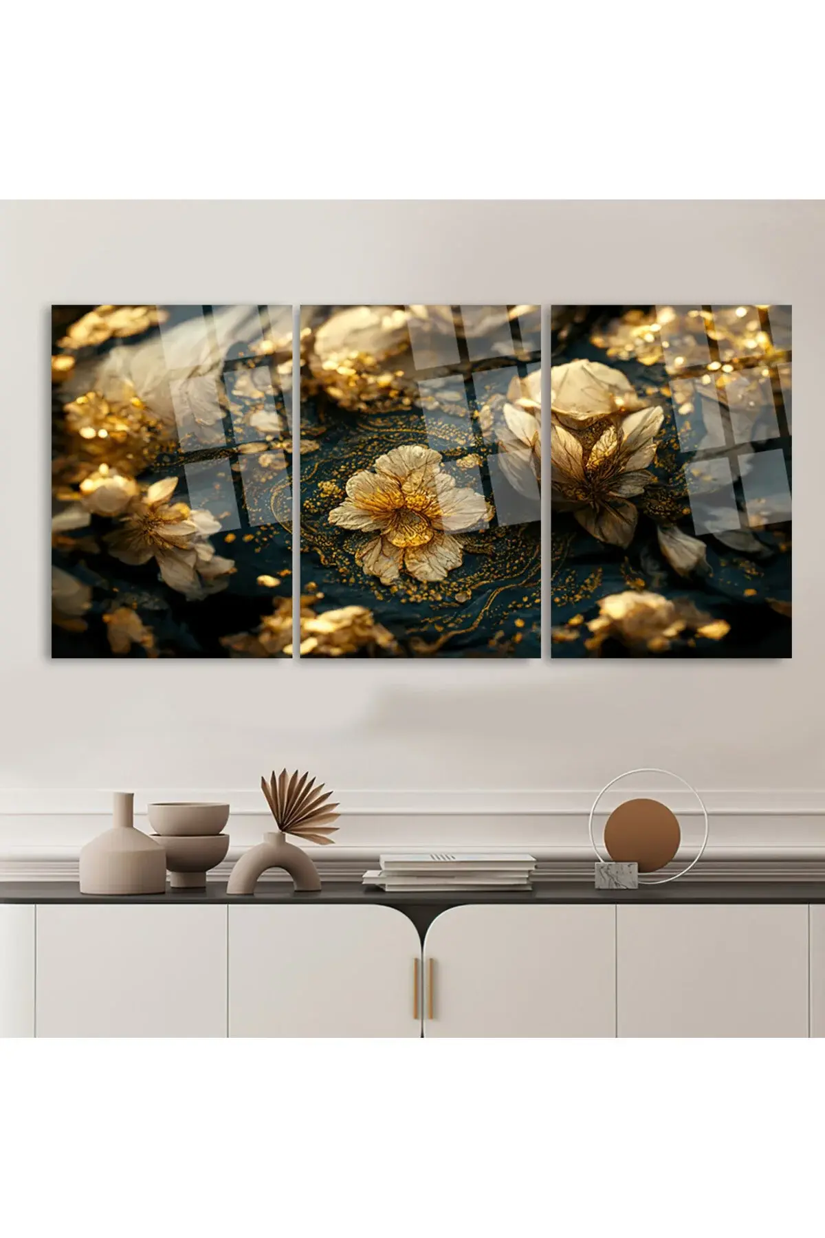 3 LÜ IŞILDAYAN ALTIN SAÇAN ÇİÇEKLER PARÇALI SET TABLO KIRILMAZ LÜKS CAM TABLO EV HEDİYESİ Sarı