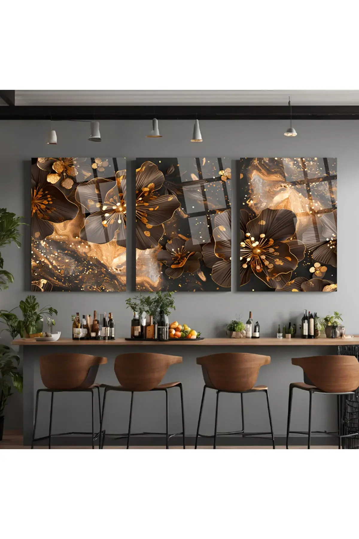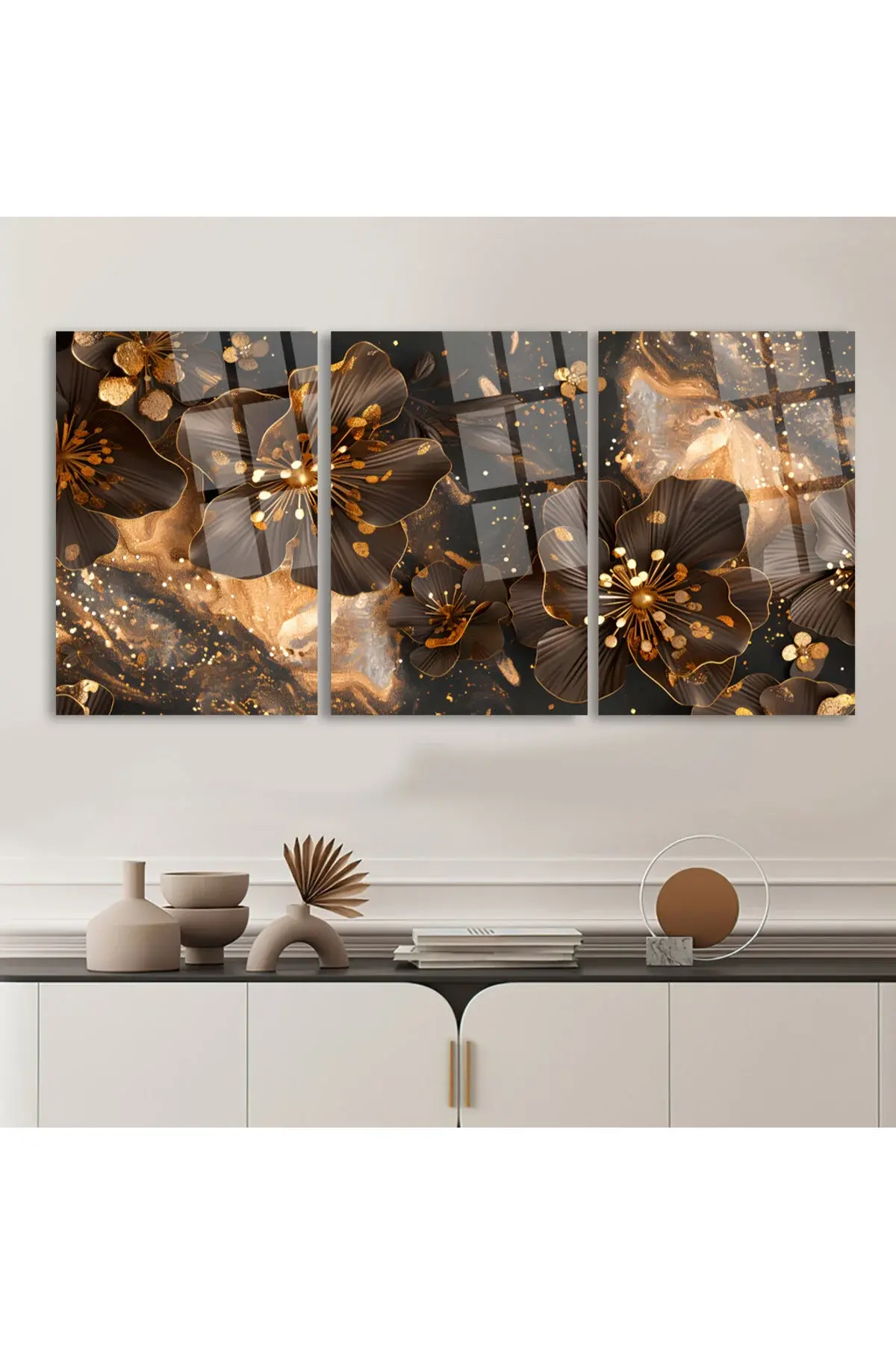 3 LÜ IŞILDAYAN PARILTILI ÇİÇEKLER PARÇALI SET TABLO KIRILMAZ LÜKS CAM TABLO EV HEDİYESİ Kahverengi