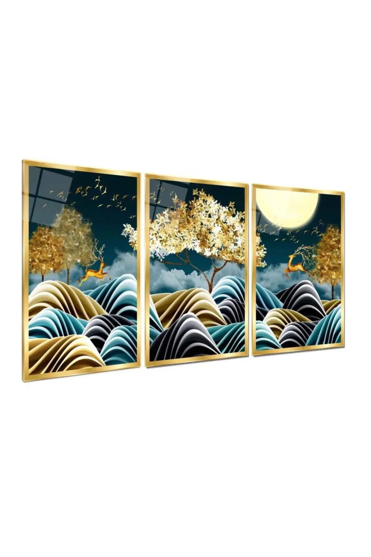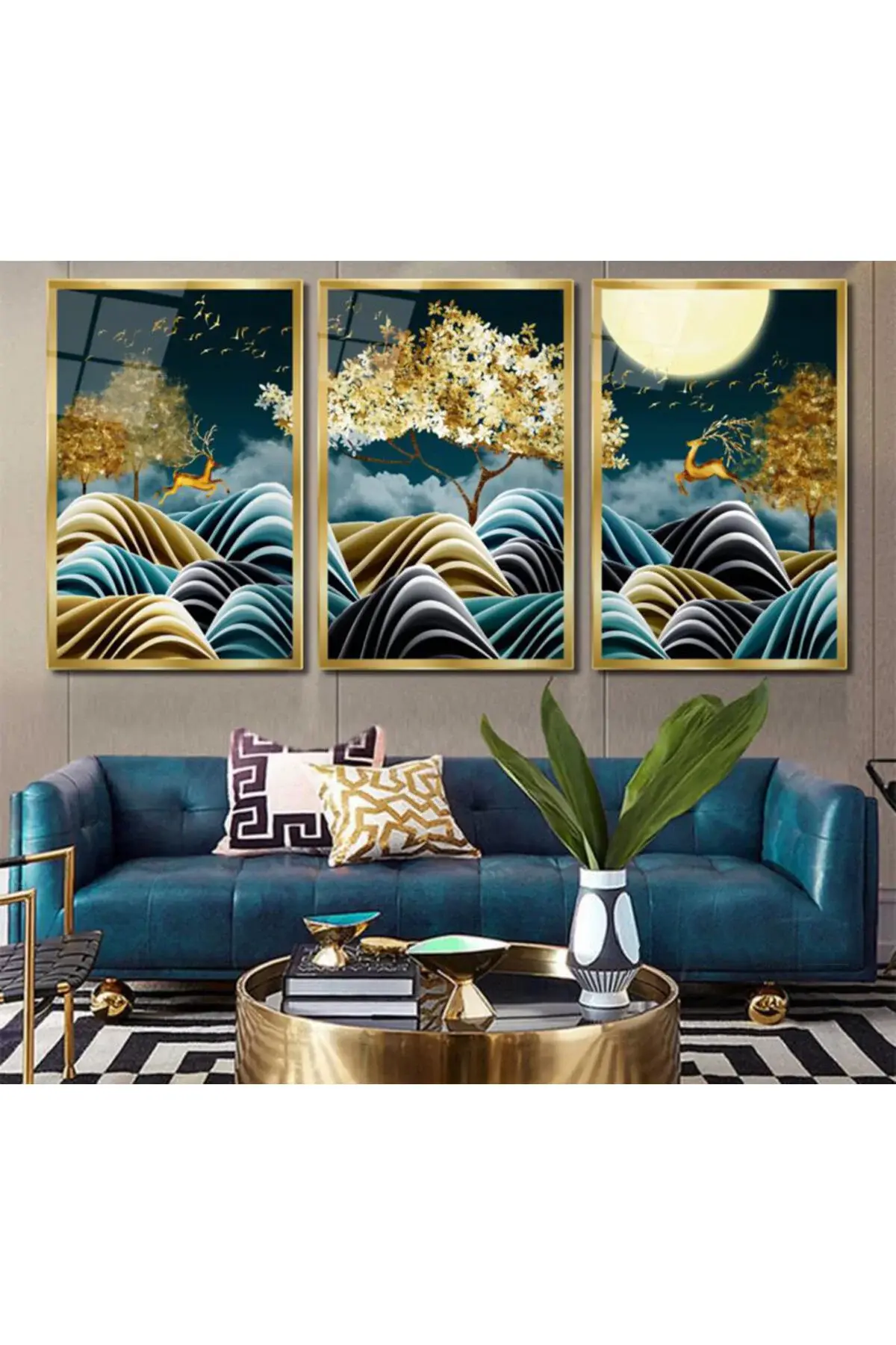 3 LÜ KOŞAN GEYİKLER ALTIN ÇENTİK DETAY MODERN TASARIM KIRILMAZ CAM TABLO LÜKS TABLO EV HEDİYESİ Lacivert