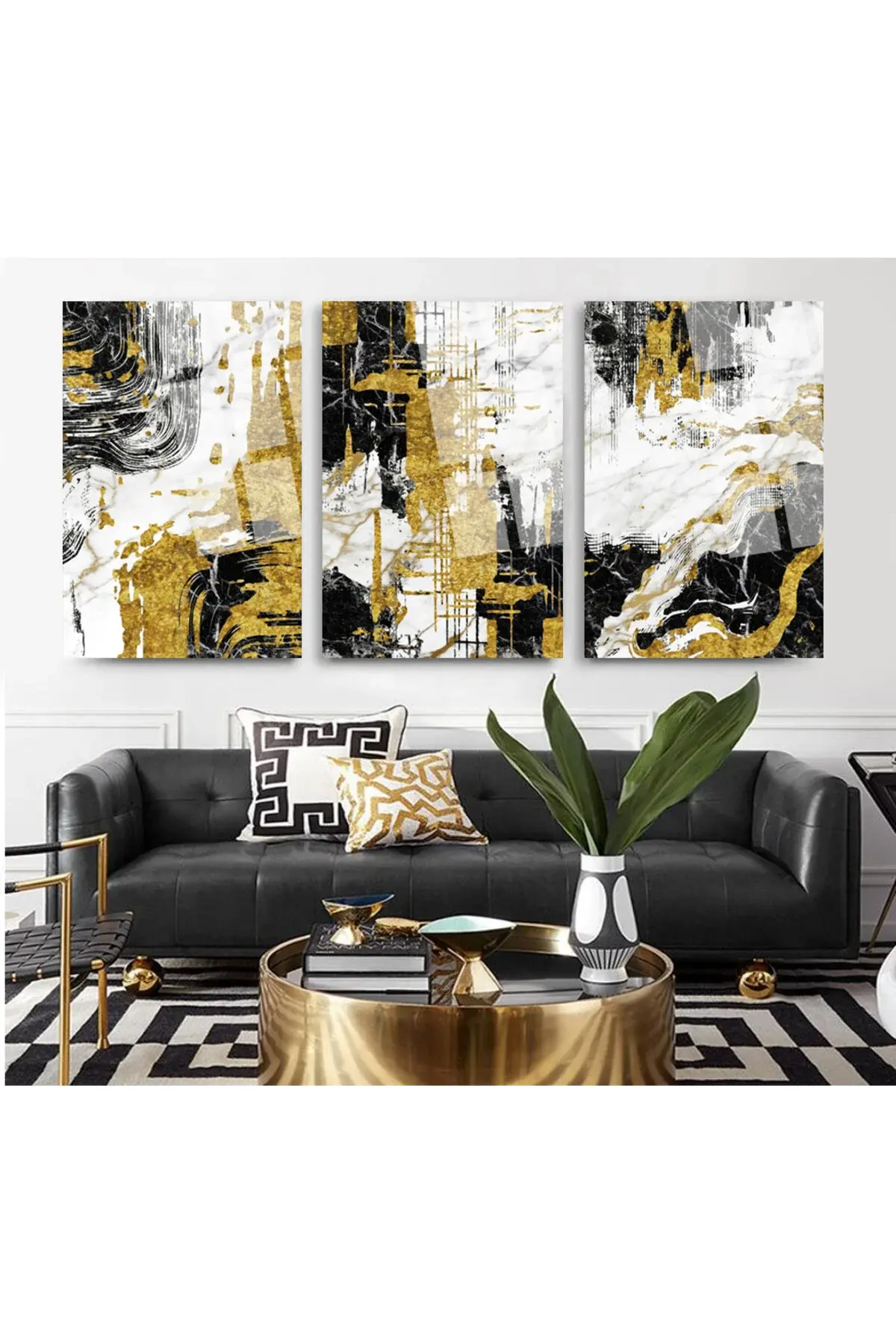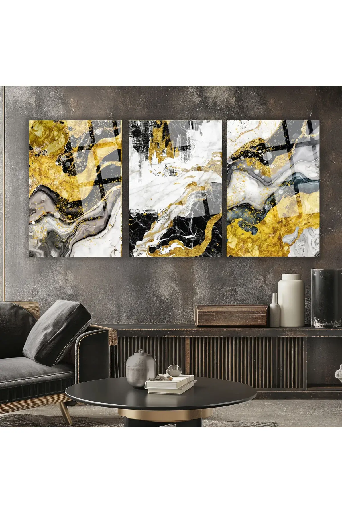 3 LÜ MERMER ALTIN DETAYLI KIRILMAZ CAM TABLO LÜKS TABLO EV HEDİYESİ Ekru