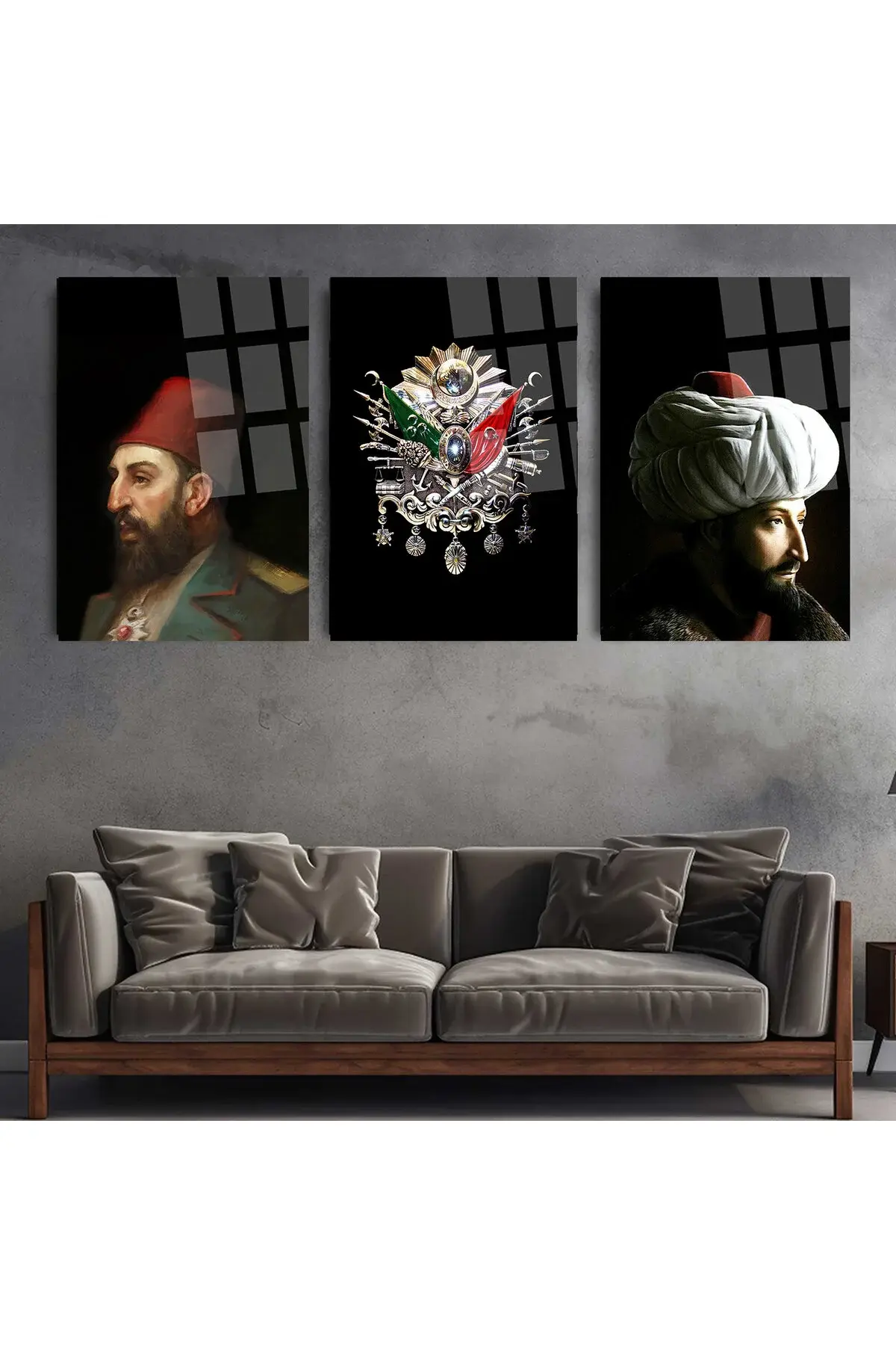 3 LÜ OSMANLI TUĞRASI FATİH SULTAN MEHMET 2.ABDULHAMİD TABLO KIRILMAZ CAM TABLO ULTRA CANLI RENKLER Siyah