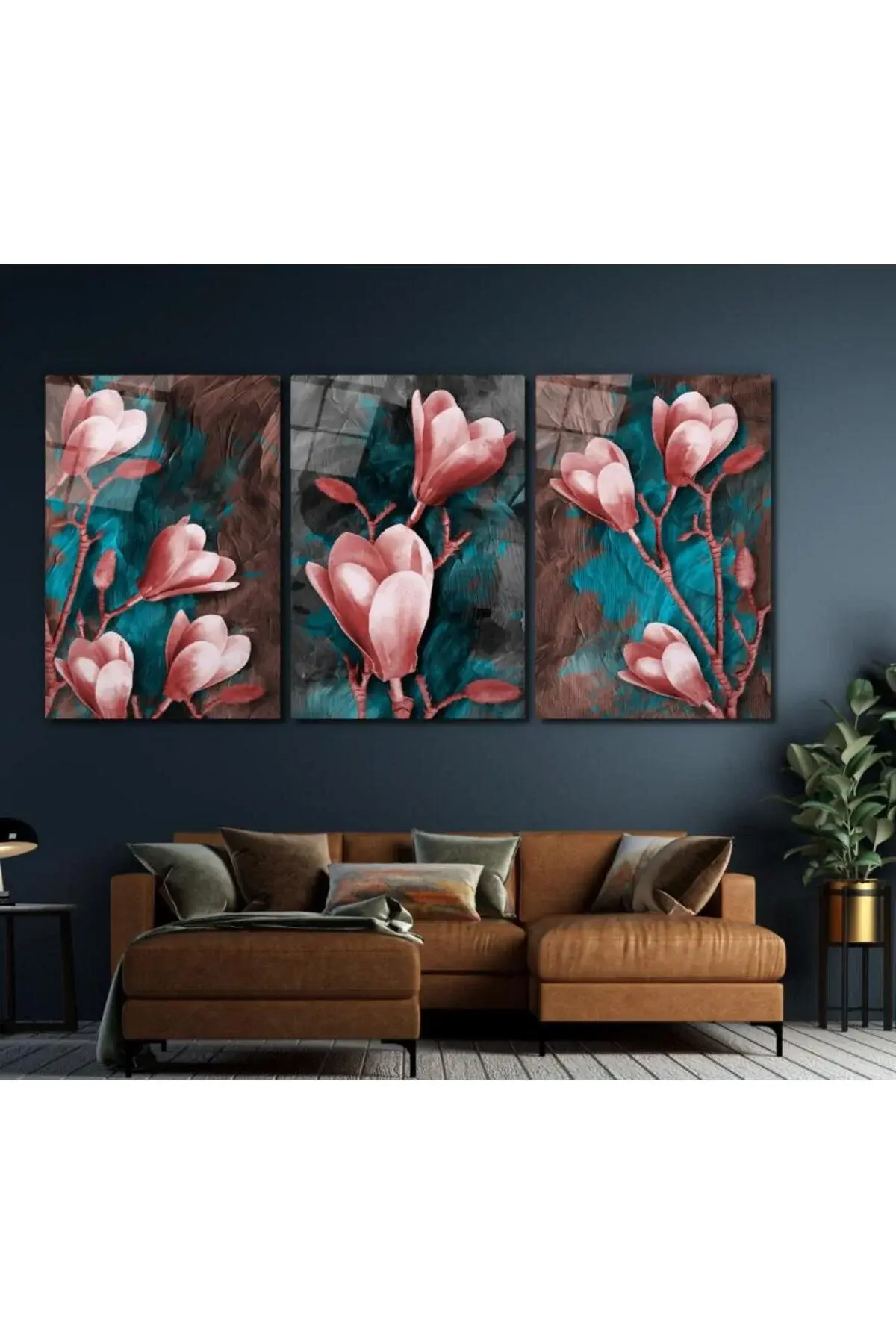 3 LÜ PEMBE ÇİÇEKLER HARİKA RENKLER MODERN TASARIM KIRILMAZ CAM TABLO LÜKS TABLO EV HEDİYESİ Pembe