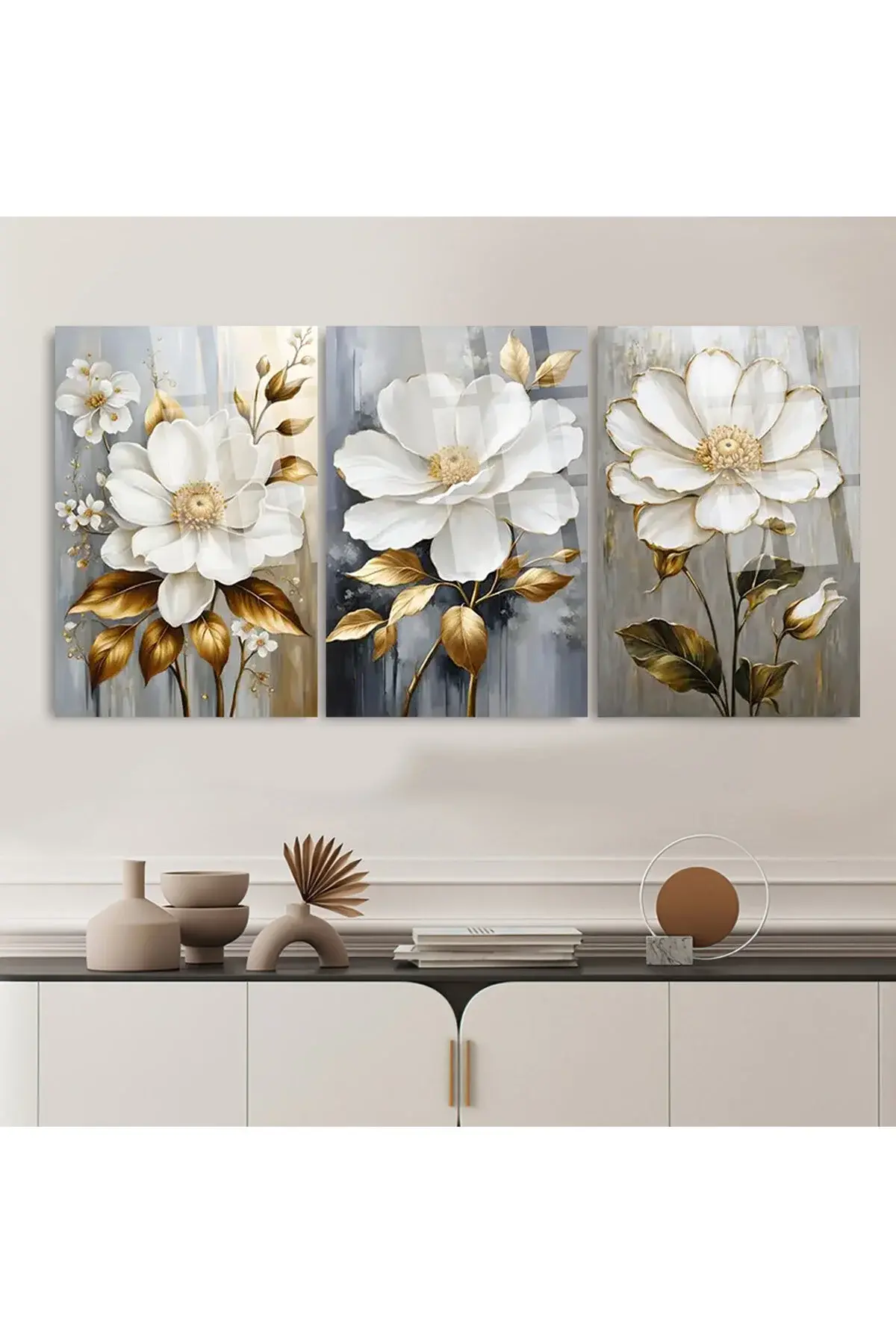 3 LÜ RENK UYUMLU ÇİÇEKLER CAM TABLO KIRILMAZ CAM TABLO ULTRA CANLI RENKLER Krem