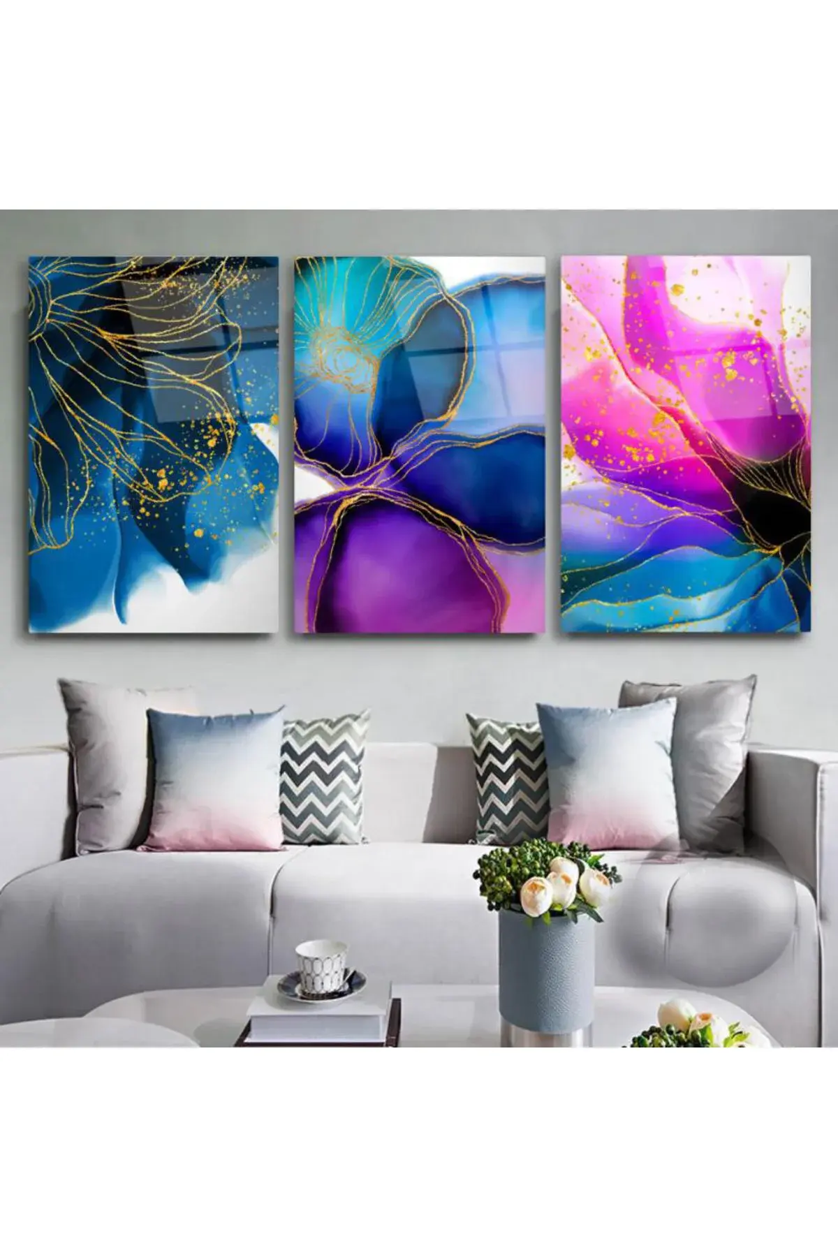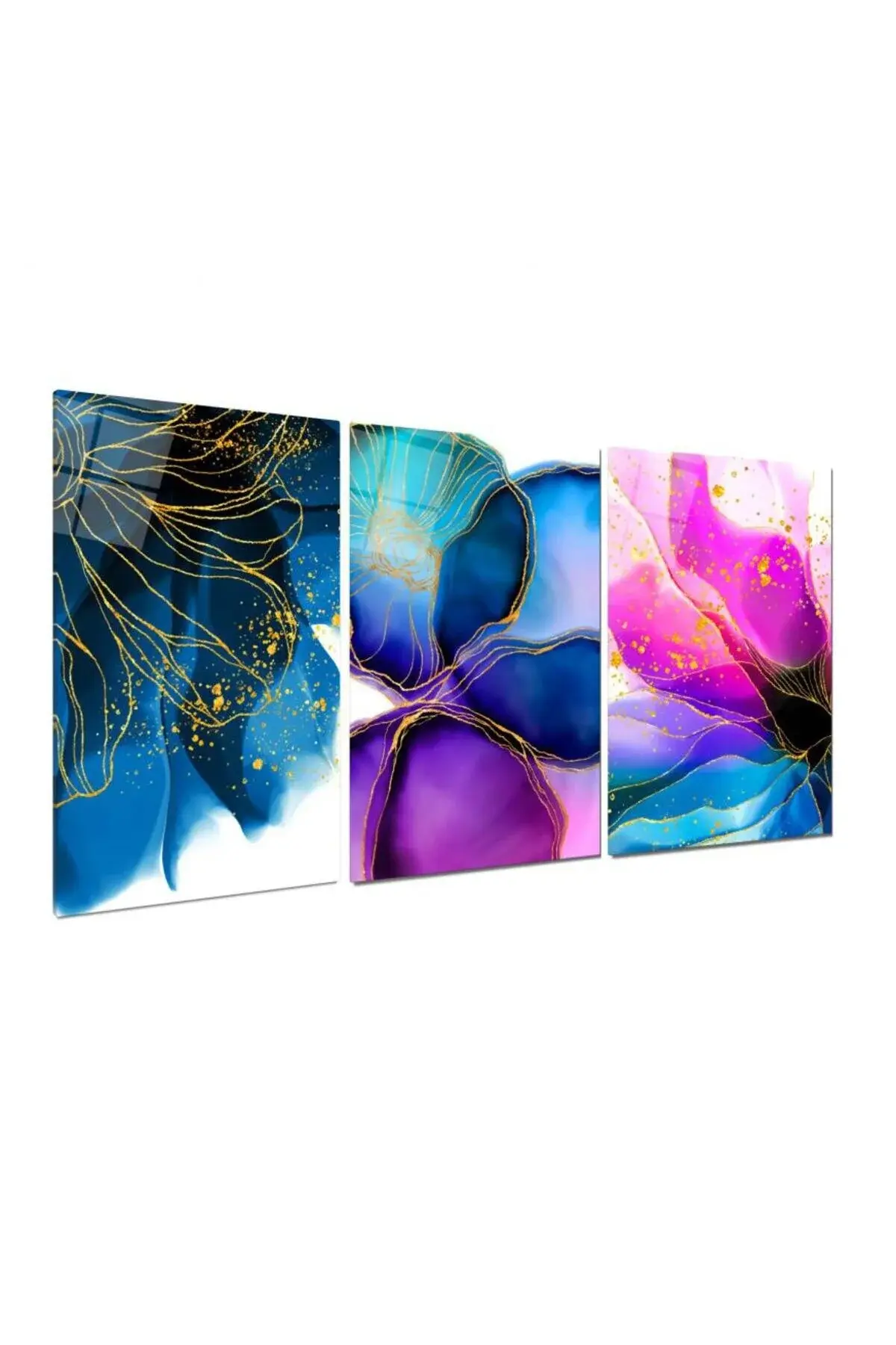 3 LÜ RENKLİ ÇİÇEKLER HARİKA UYUM KIRILMAZ CAM TABLO ULTRA CANLI RENKLİ MODERN EV HEDİYESİ Çok Renkli