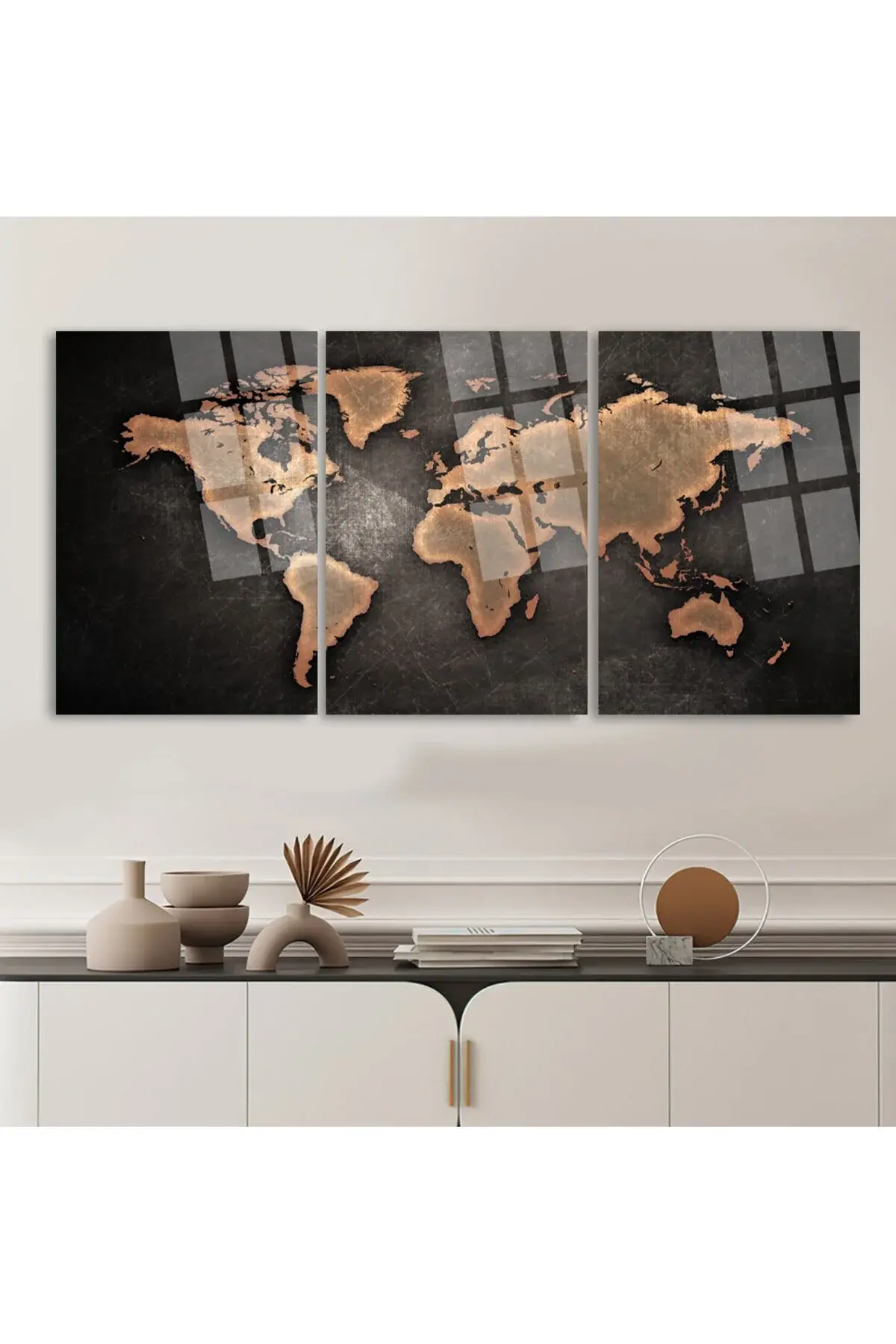3 LÜ RETRO KAHVERENGİ DÜNYA HARİTASI PARÇALI SET TABLO KIRILMAZ LÜKS CAM TABLO EV HEDİYESİ Kahverengi