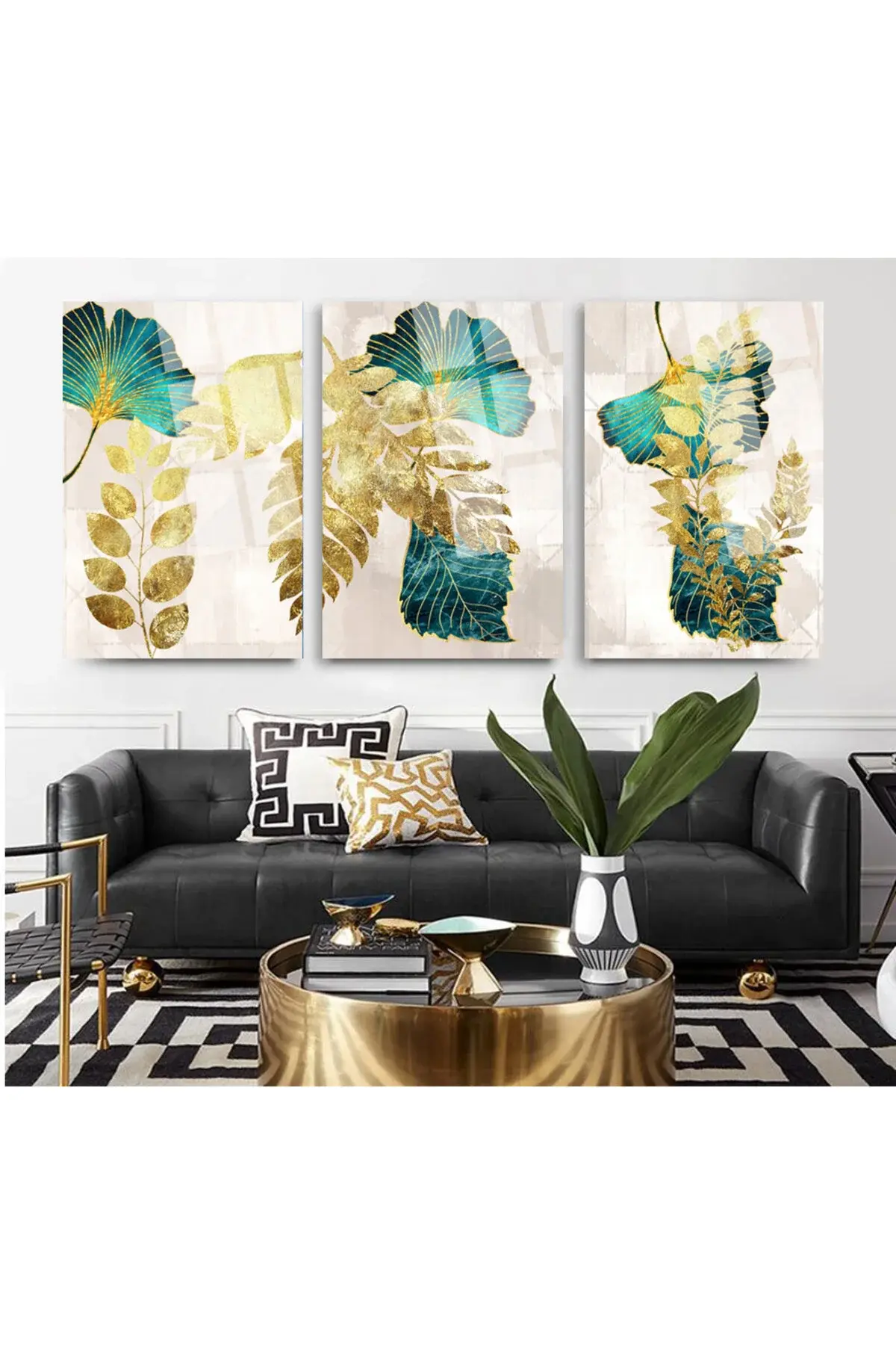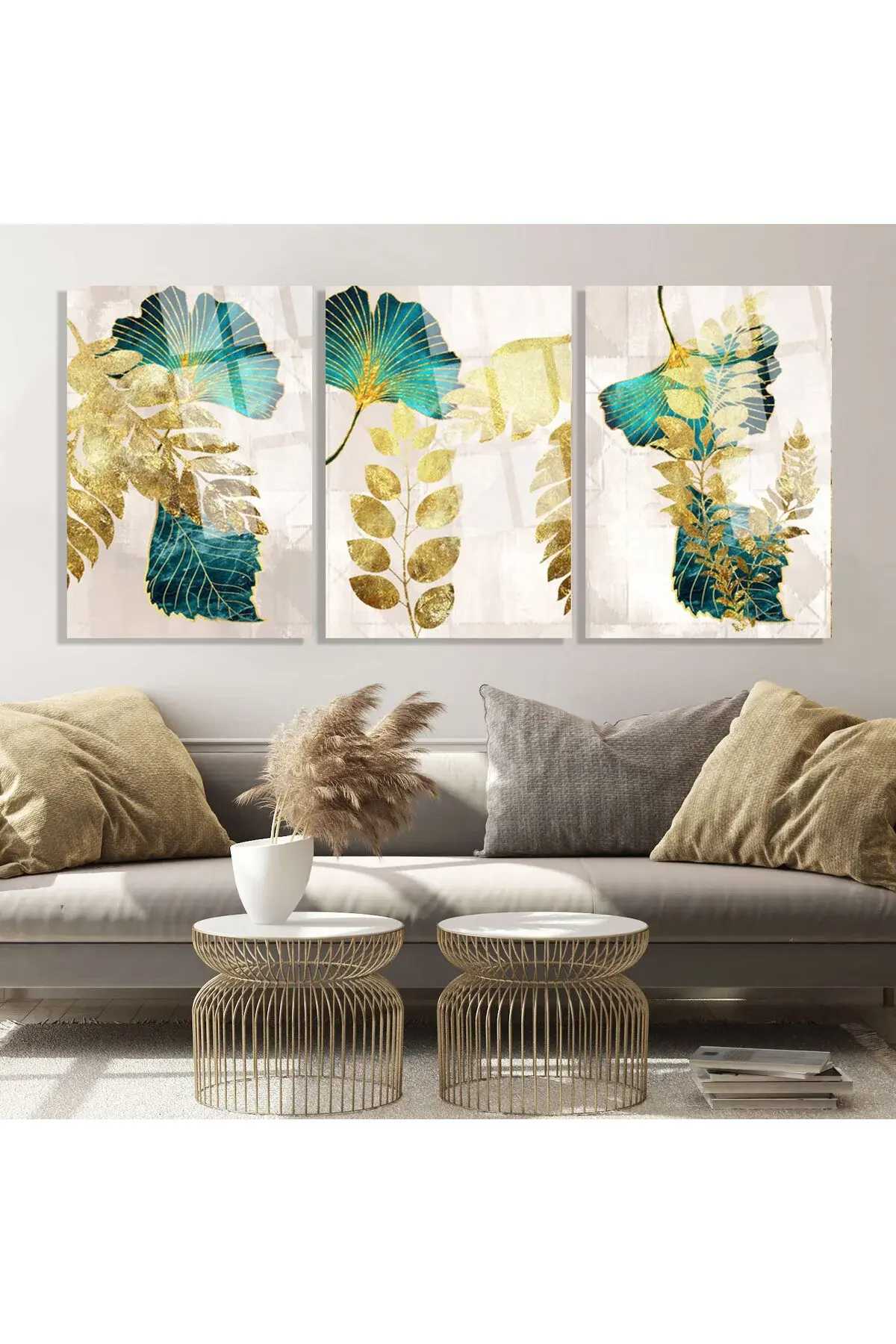 3 LÜ SET ALTIN DESENLİ HARİKA RENK UYUMLU KIRILMAZ LÜKS CAM TABLO EV HEDİYESİ Krem