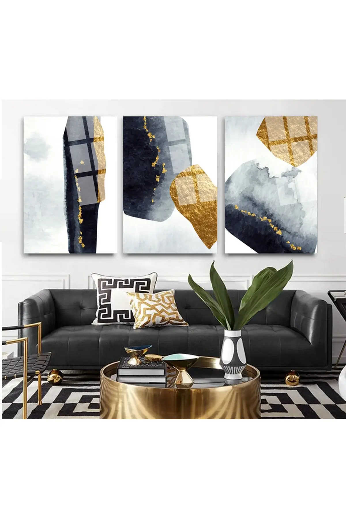 3 LÜ SET TABLO MERMER ÜZERİNE GEOMETRİK DESENLİ KIRILMAZ CAM TABLO EV HEDİYESİ Beyaz