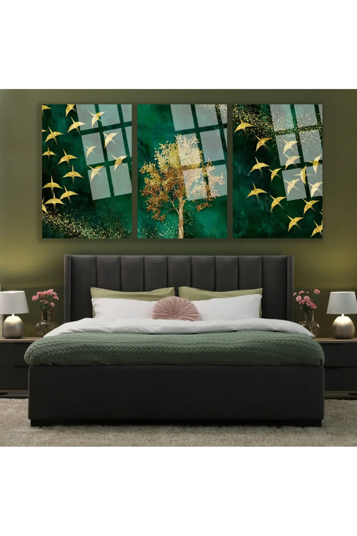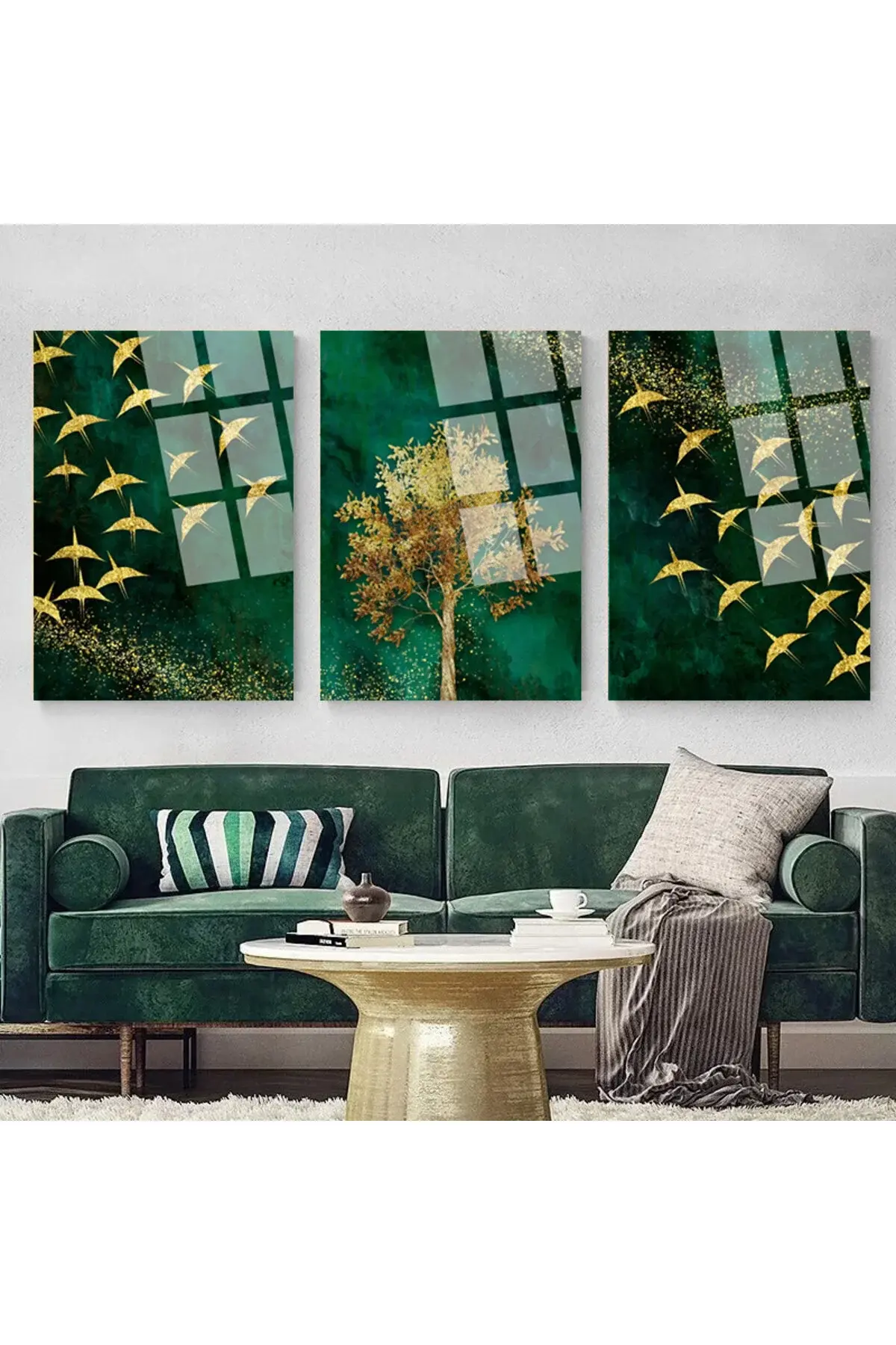3 LÜ SET TABLO YEŞİL TEMA ARKASI GOLD YAPRAKLAR KIRILMAZ LÜKS CAM TABLO EV HEDİYESİ Yeşil