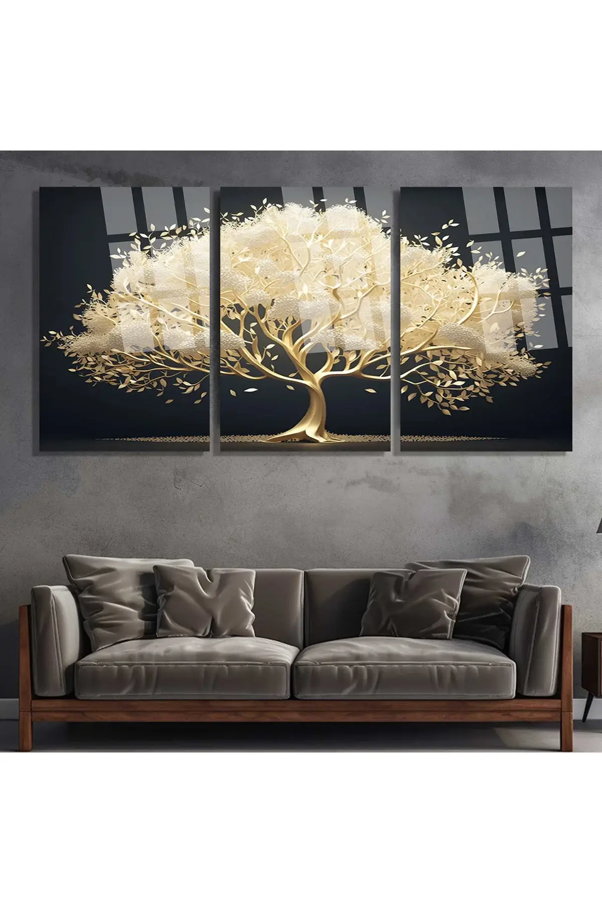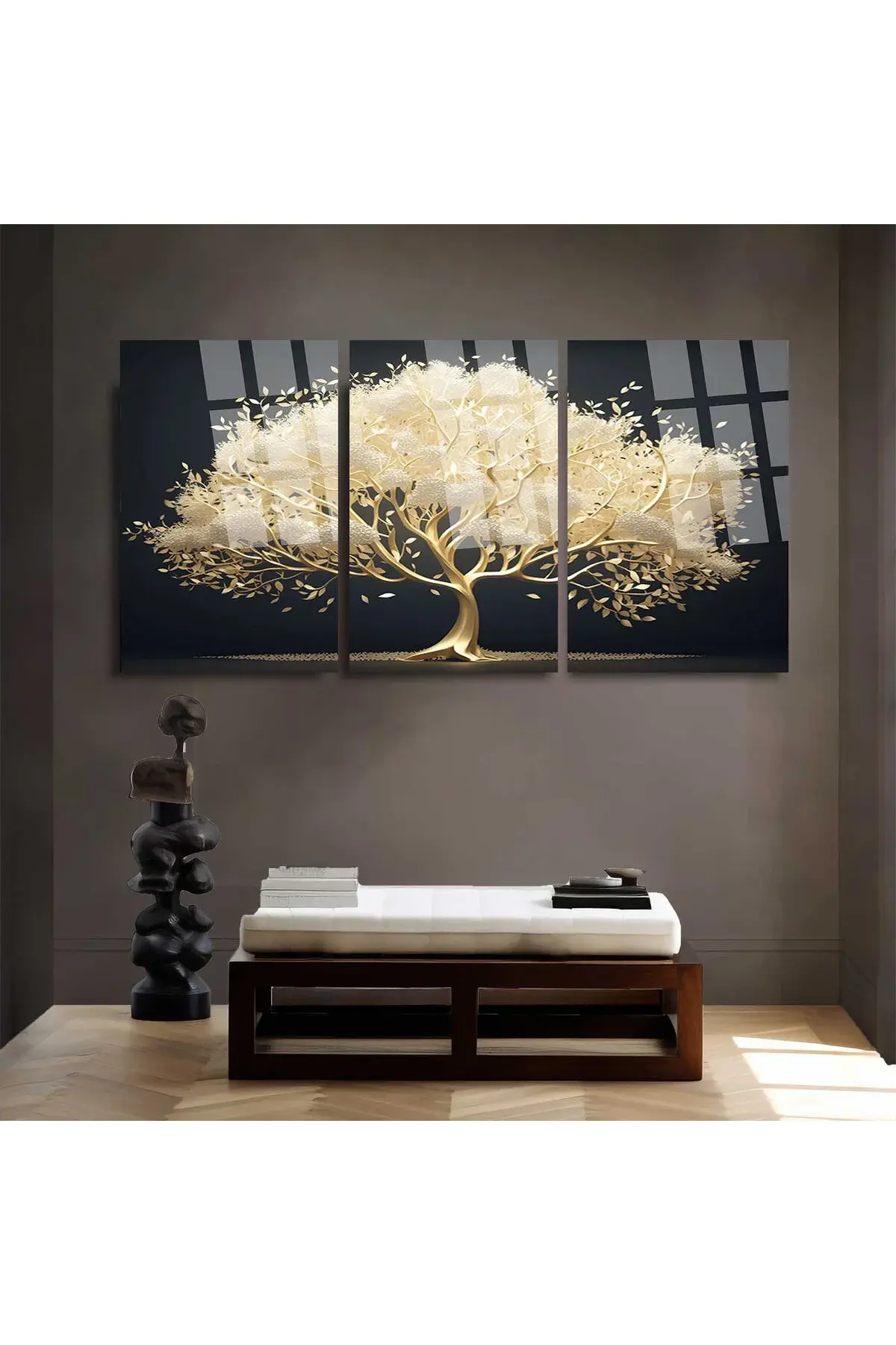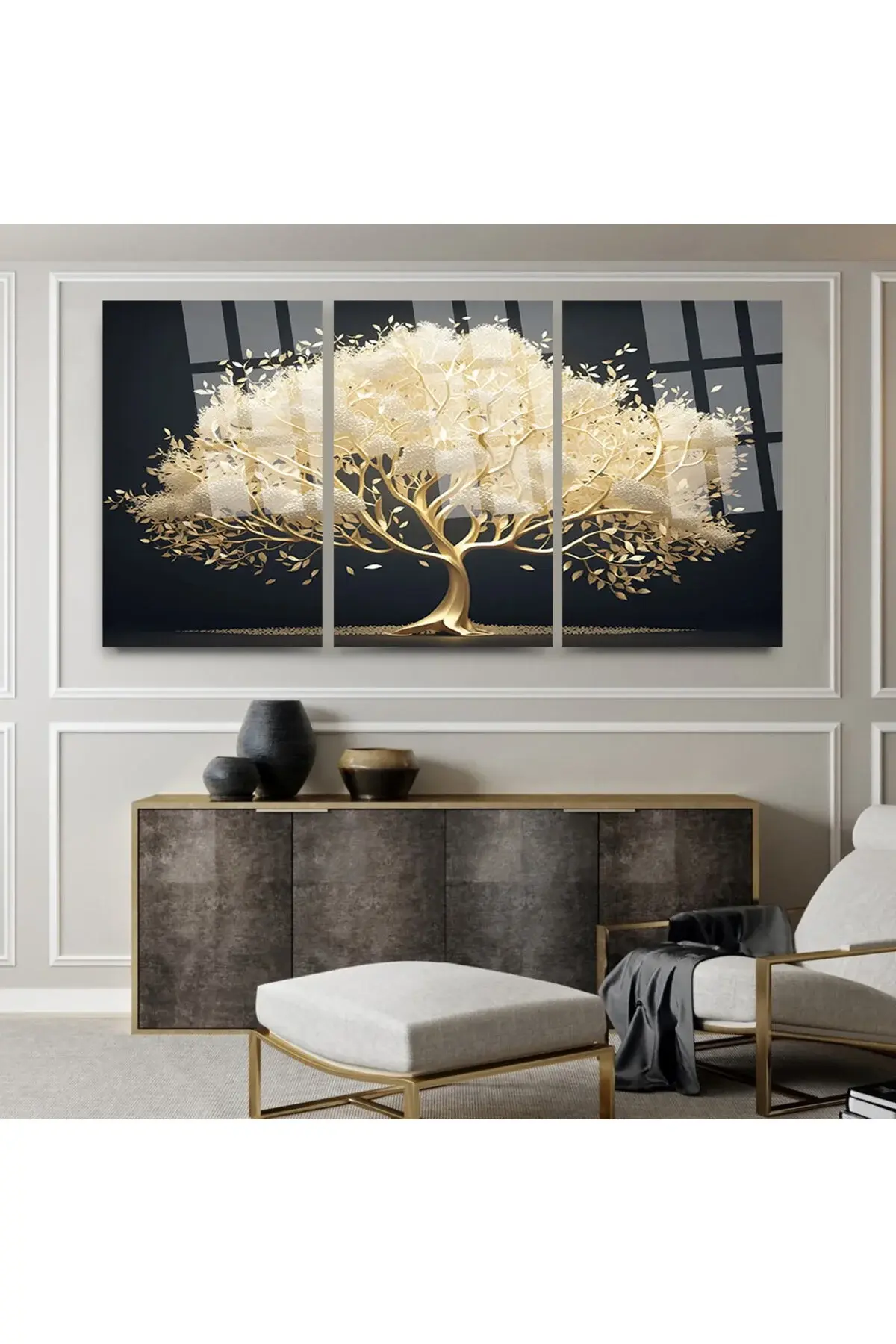 3 LÜ SİYAH ARKA TEMA ALTIN AĞAÇ TASARIM CAM TABLO KIRILMAZ CAM TABLO ULTRA CANLI RENKLER Siyah