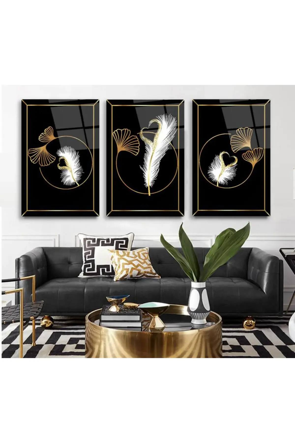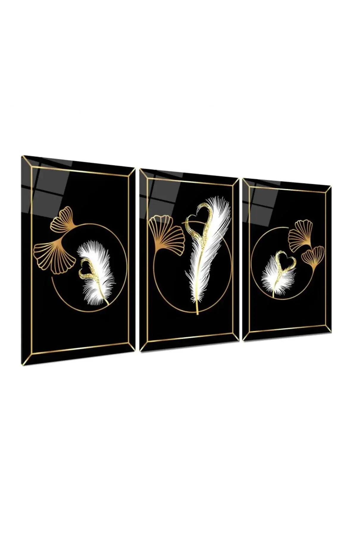 3 LÜ SİYAH ÇİÇEK GOLD DETAY HARİKA UYUM KIRILMAZ CAM TABLO ULTRA CANLI RENKLİ MODERN EV HEDİYESİ Siyah