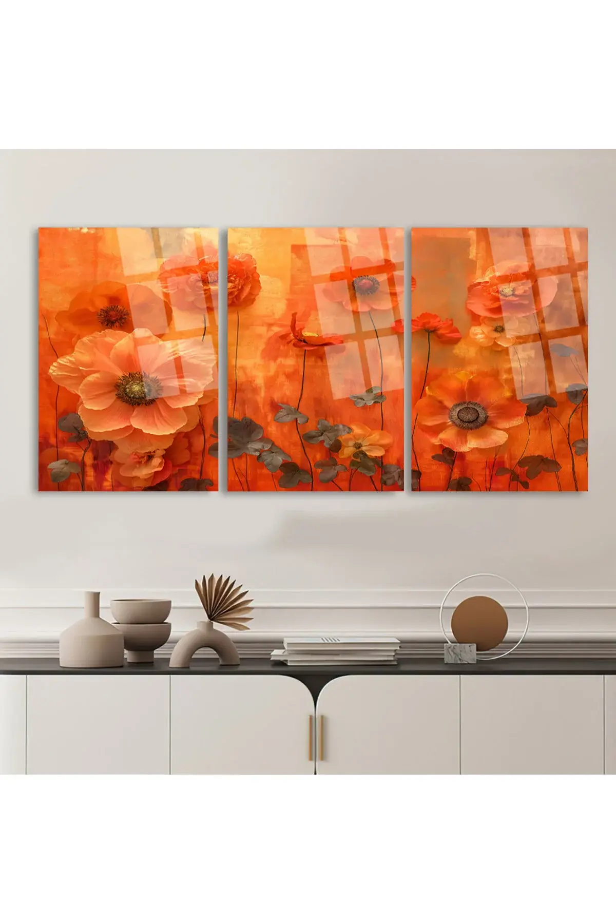 3 LÜ TURUNCU BOHEM ODASI ÇİÇEKLER PARÇALI SET TABLO KIRILMAZ LÜKS CAM TABLO EV HEDİYESİ Turuncu