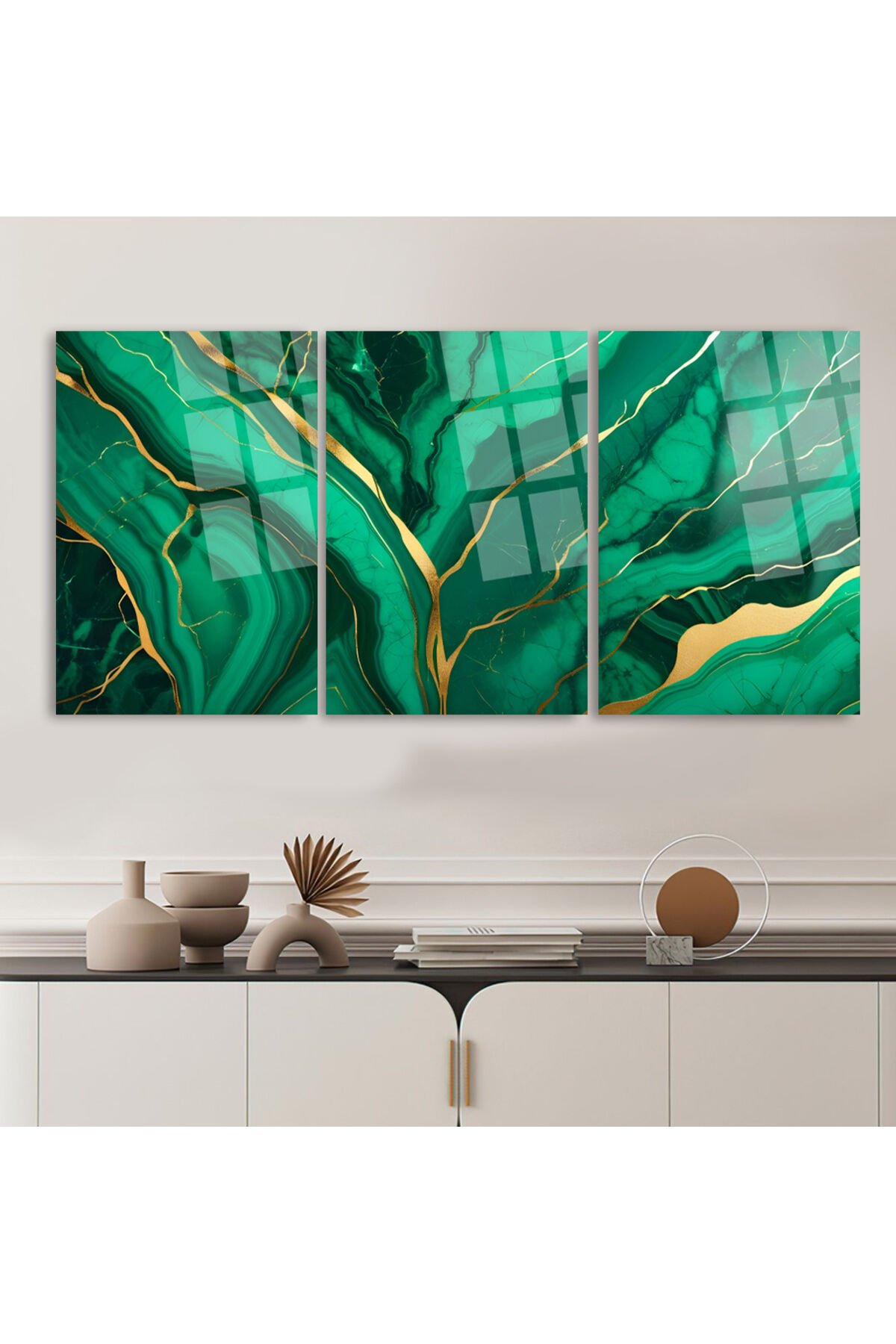3 LÜ YEŞİL GOLD DETAY MERMER PARÇALI SET TABLO KIRILMAZ LÜKS CAM TABLO EV HEDİYESİ