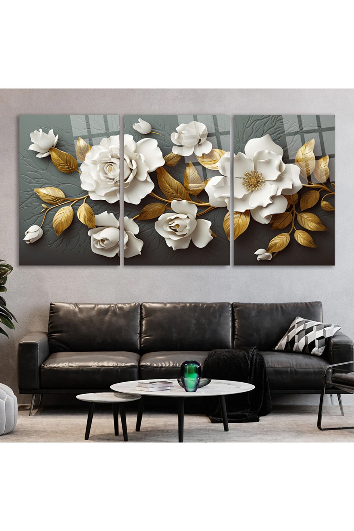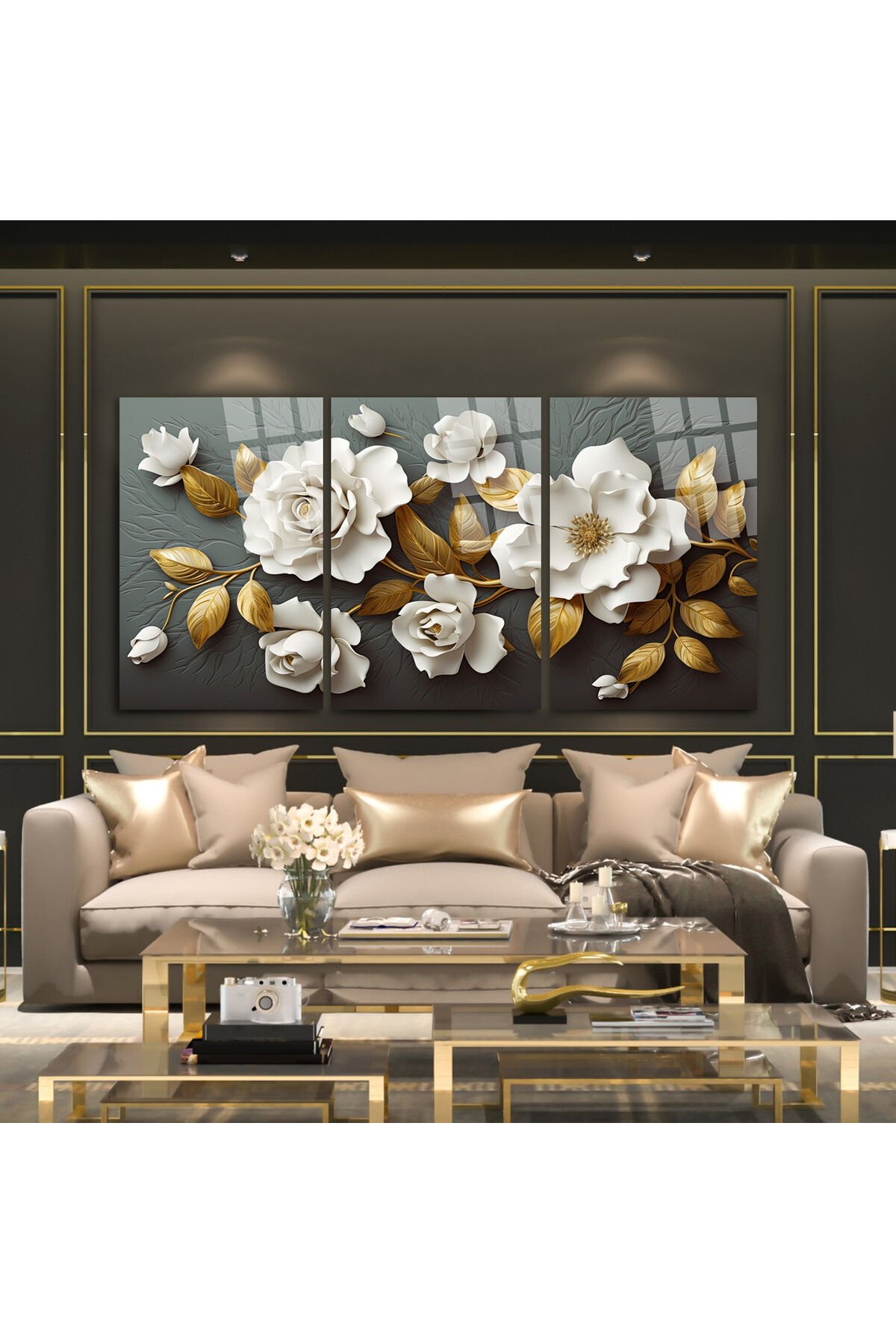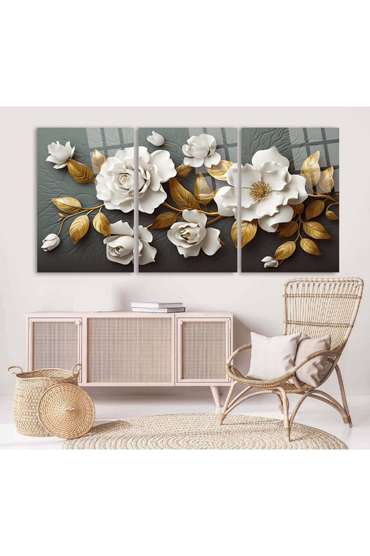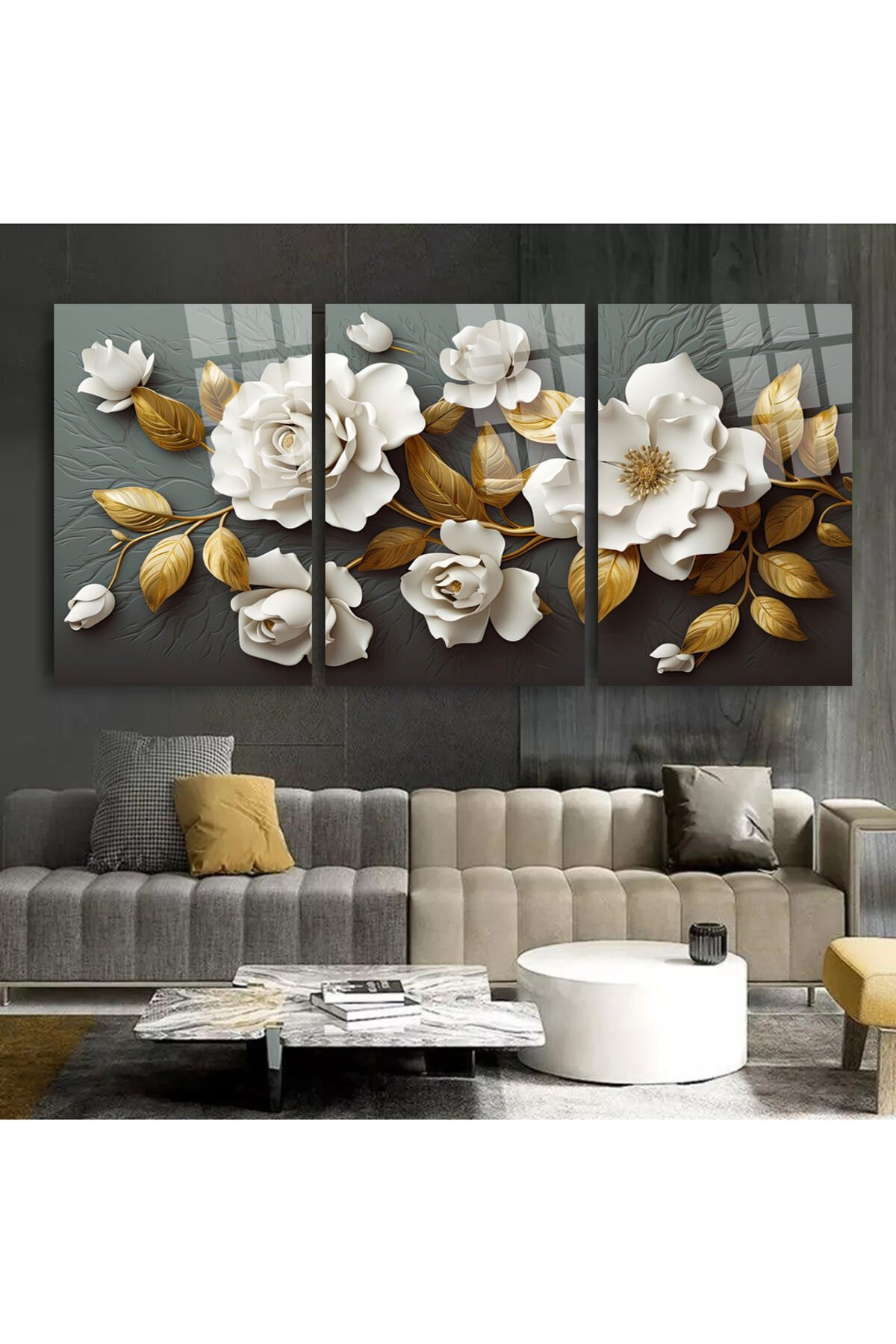 3 PARÇA GOLD YAPRAKLI BEYAZ ÇİÇEK SET TABLO LÜKS KIRILMAZ CAM TABLO EV HEDİYESİ İŞ YERİ HEDİYESİ